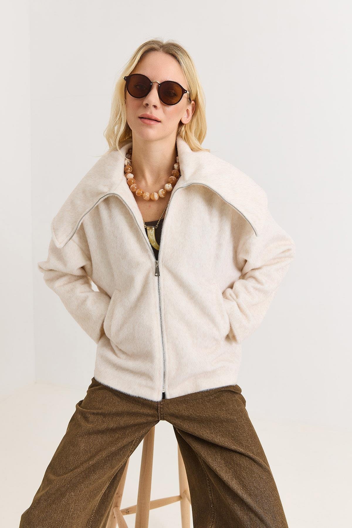 Kadın Suni Kürk Cepli Fermuarlı Mont Krem (500798MNTXKRM)