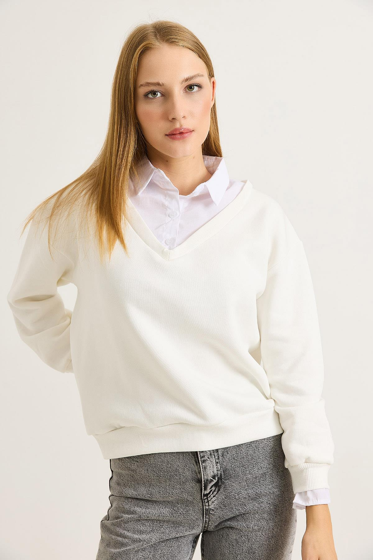 Kadın Üç İplik Şardonlu Gömlek Yaka Swet Beyaz (500744SWTXBYZ)