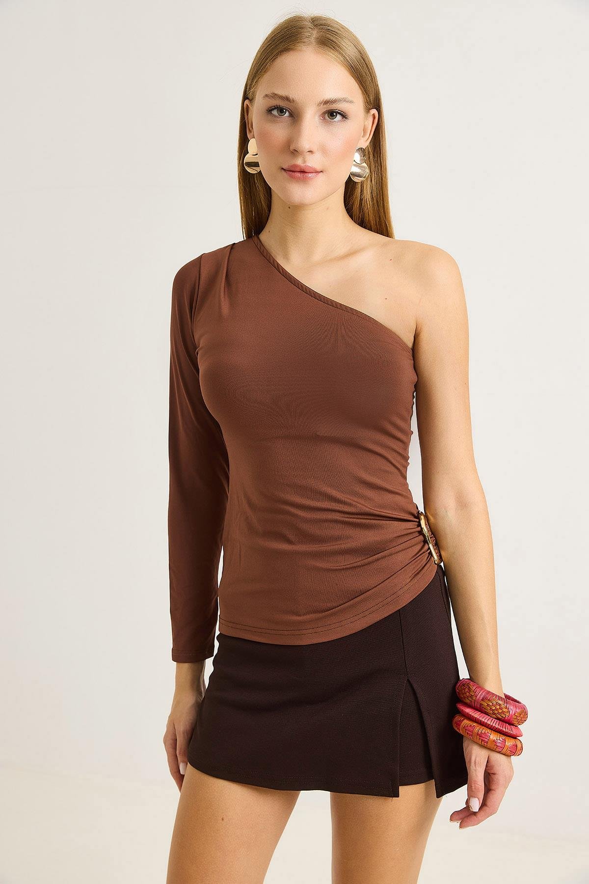 Kadın Yanı Aksesuar Detaylı Tek Omuz Bluz Kahverengi (251309BLZXKHV)