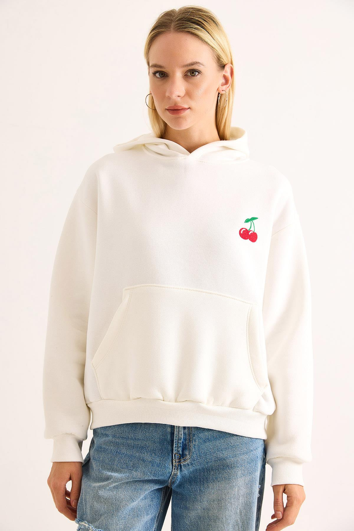 Kiraz Nakışlı Şardonlu Üç İplik Kapişonlu Swet Beyaz (500752SWTXBYZ)