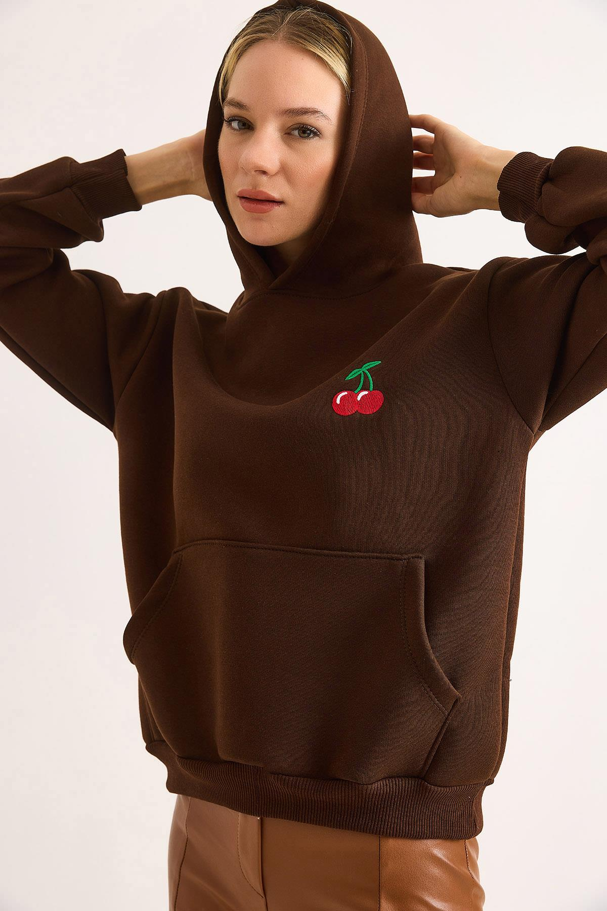 Kiraz Nakışlı Şardonlu Üç İplik Kapişonlu Swet Kahverengi (500752SWTXKHV)