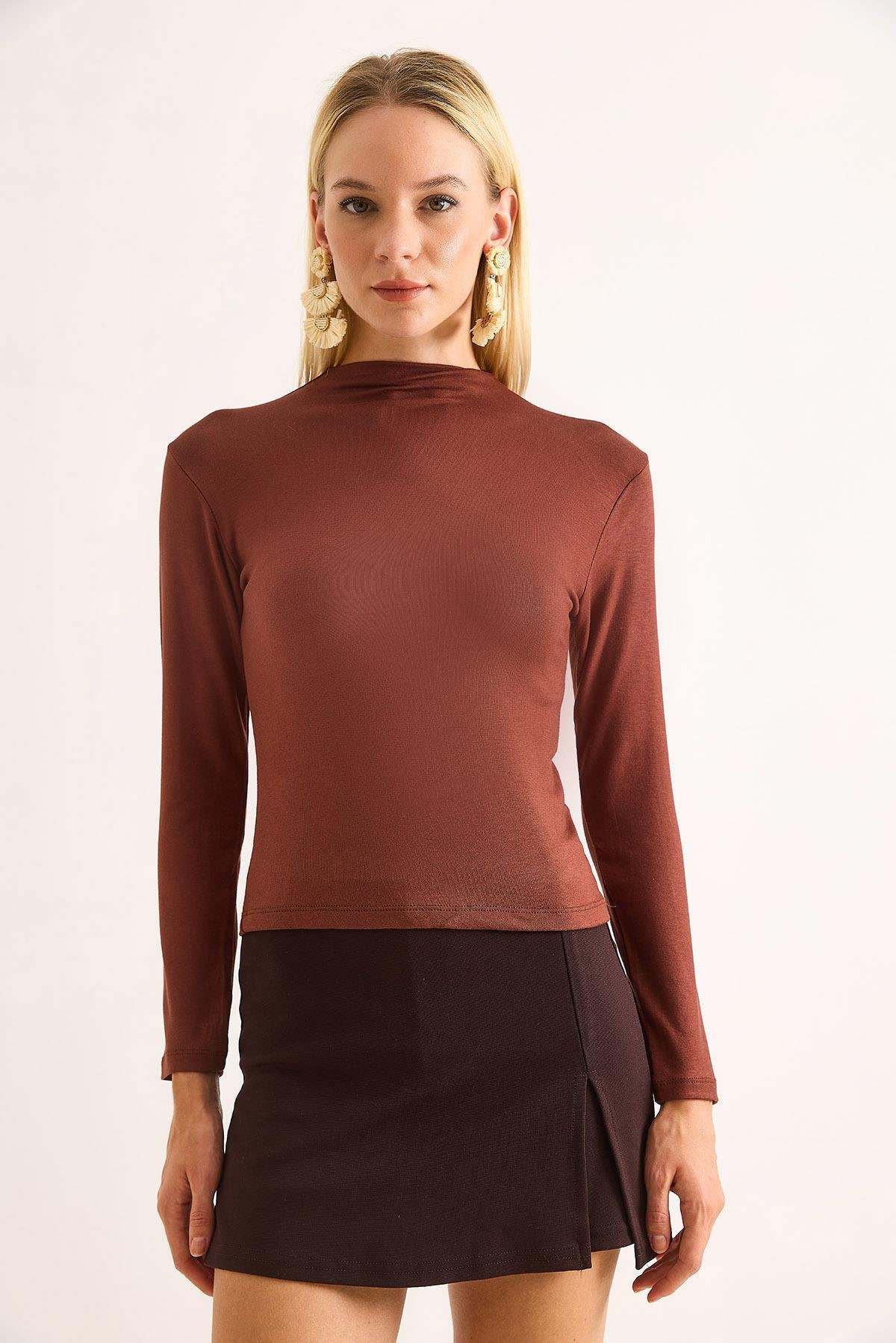 Vücuda Oturan Uzun Kollu Dik Yaka Fitilli Esnek Örme Bluz Kahverengi (251313BLZXKHV)