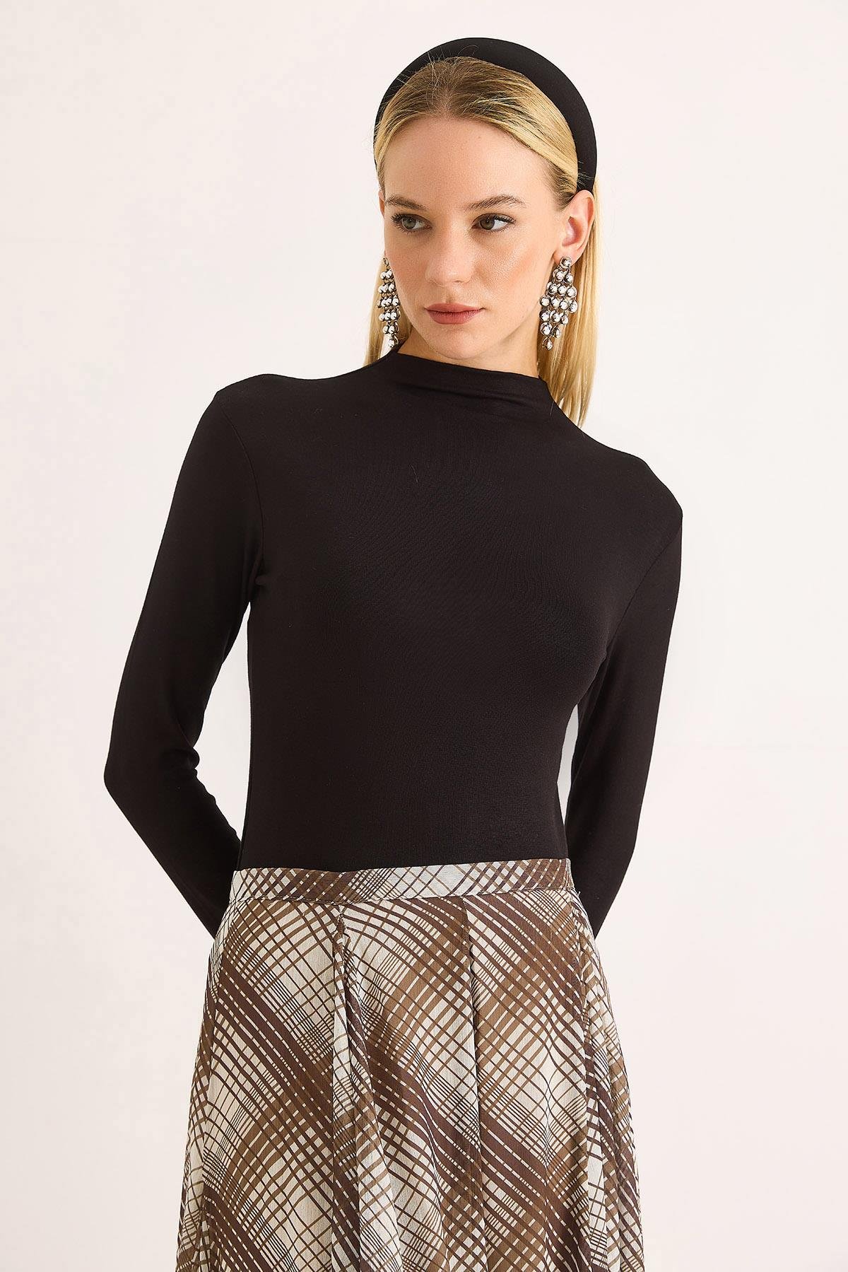 Vücuda Oturan Uzun Kollu Dik Yaka Fitilli Esnek Örme Bluz Siyah (251313BLZXSYH)