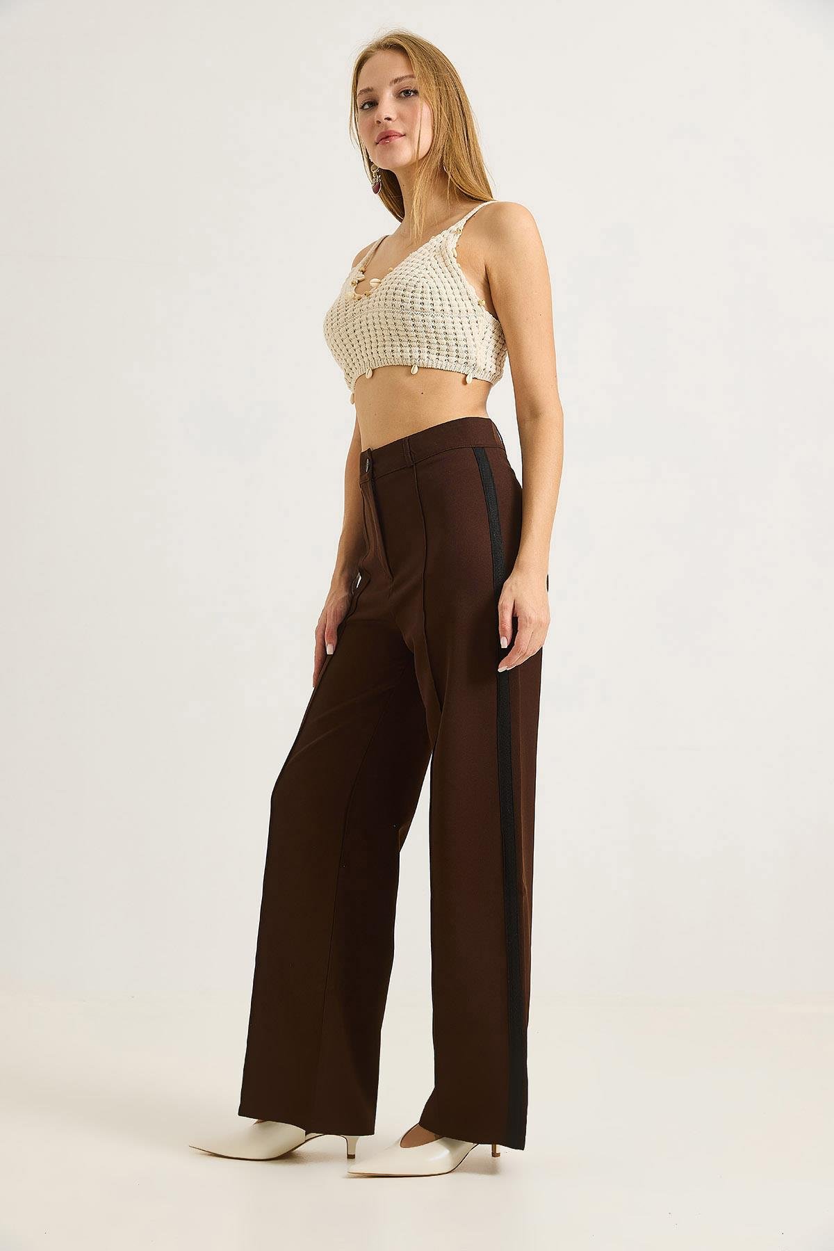 Yanları Şeritlik Bol Paça Kadın Pantolon Kahverengi (500500PNTXKHV)