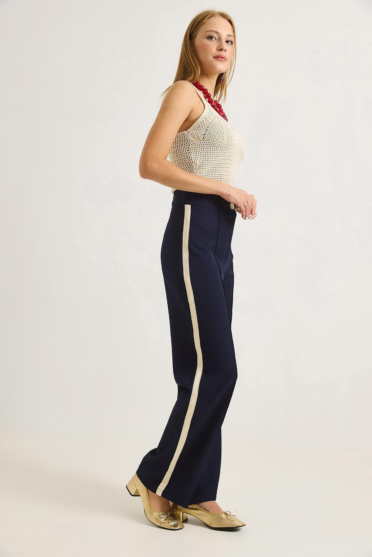 Yanları Şeritlik Bol Paça Kadın Pantolon Lacivert (500500PNTXLACİ)