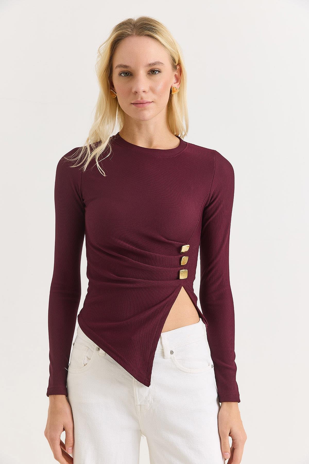 Yanları Tokalı ve Yırtmaçlı Uzun Kollu Bluz Bordo (500783BLZXBRD)