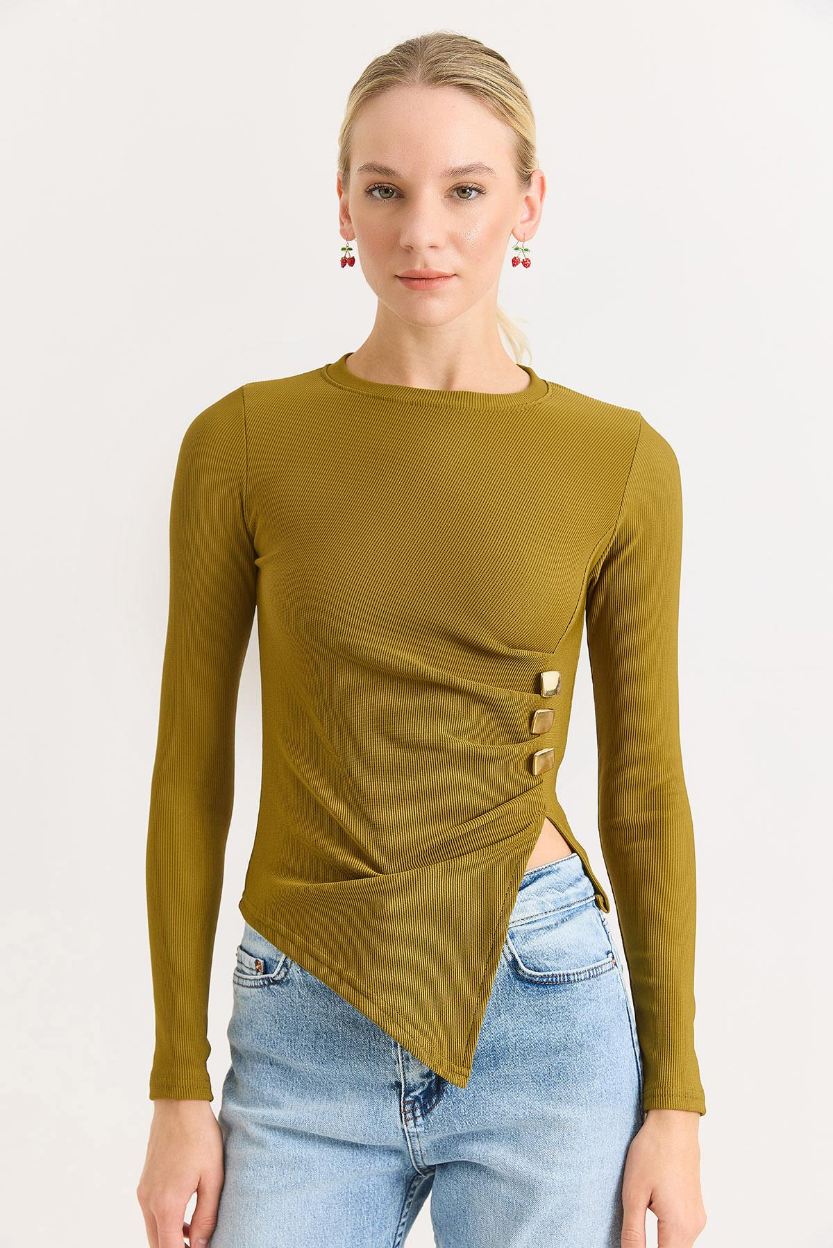 Yanları Tokalı ve Yırtmaçlı Uzun Kollu Bluz Haki (500783BLZXHKİ)