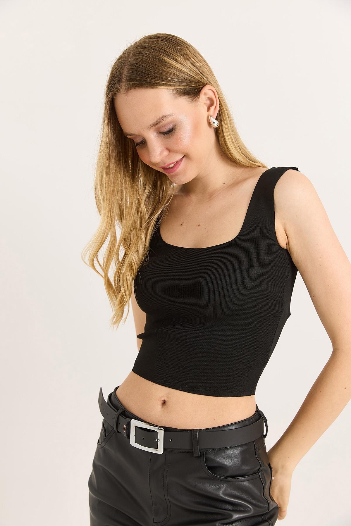Kare Yaka Crop Triko Bluz Siyah (252025BLZXSYH)