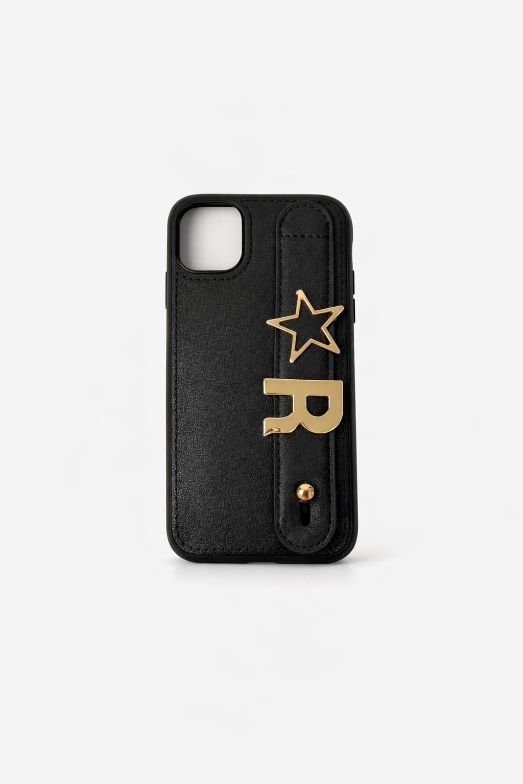 14 Pro Max Charmlı ve Harfli Deri Kılıf Siyah