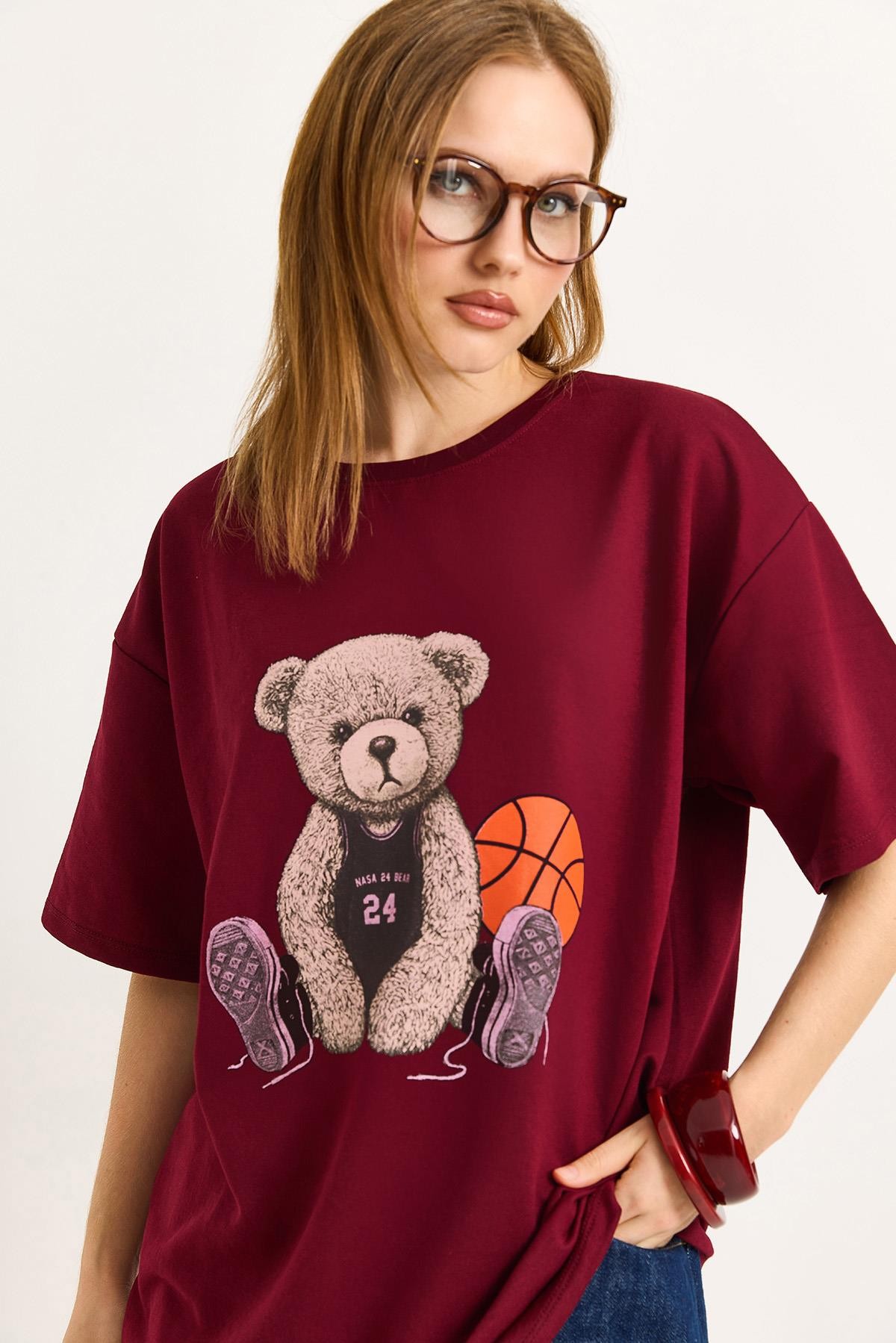 Ayıcık Baskılı Bisiklet Yaka Tshirt  Bordo