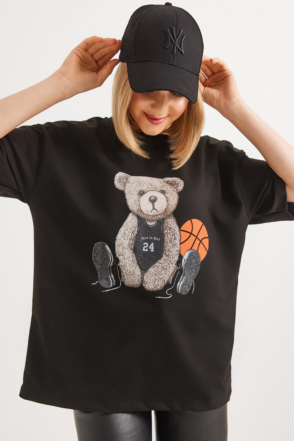 Ayıcık Baskılı Bisiklet Yaka Tshirt Siyah (250560TSHXSYH)