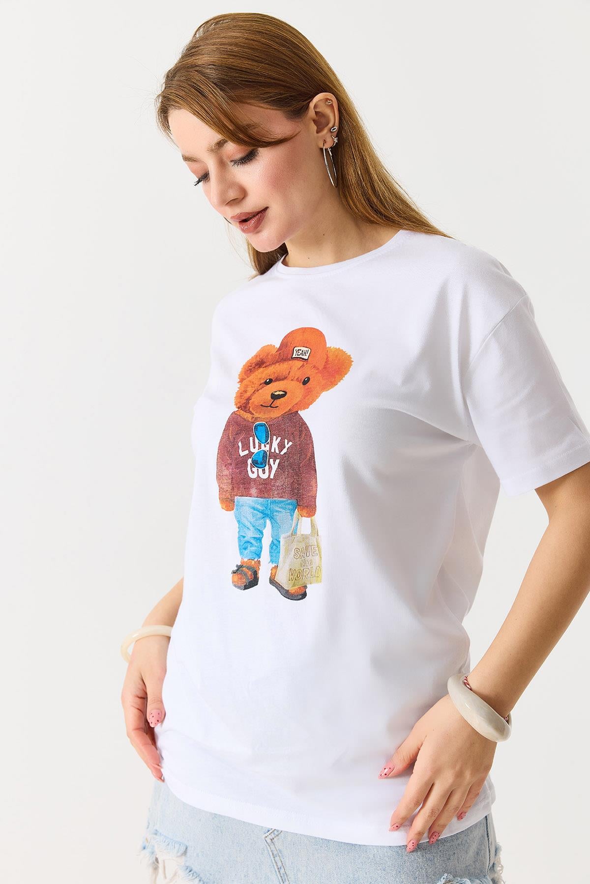 Ayıcık Baskılı Pamuklu Bisiklet Yaka Tshirt Beyaz (600345TSHXBYZ)