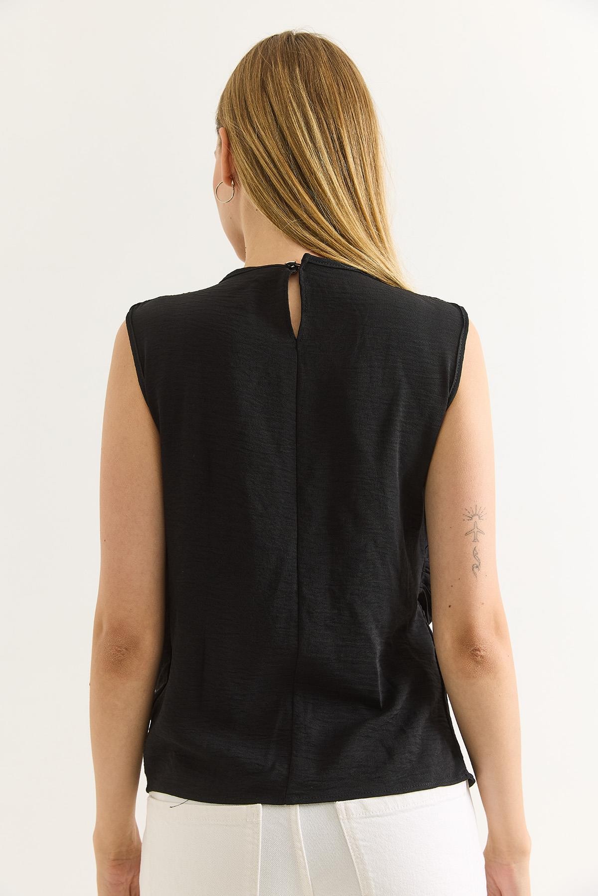 Ayrobin Kumaş Drapeli Siyah Kolsuz Bluz