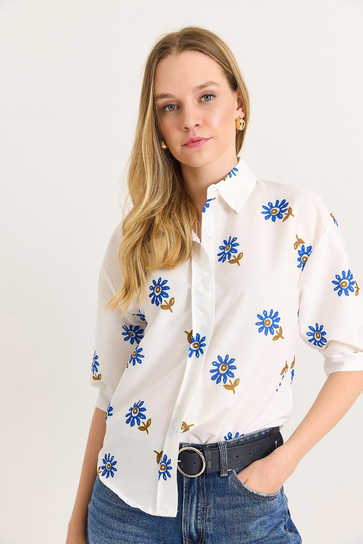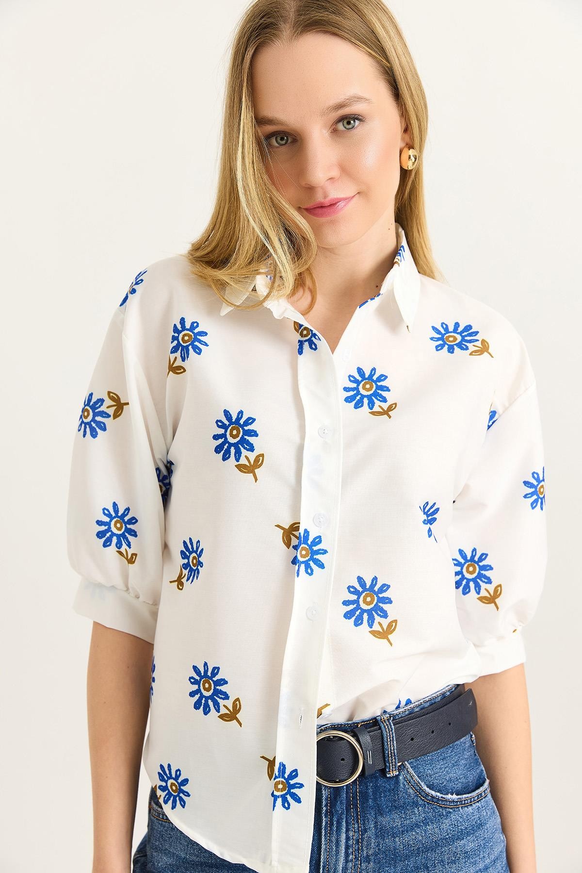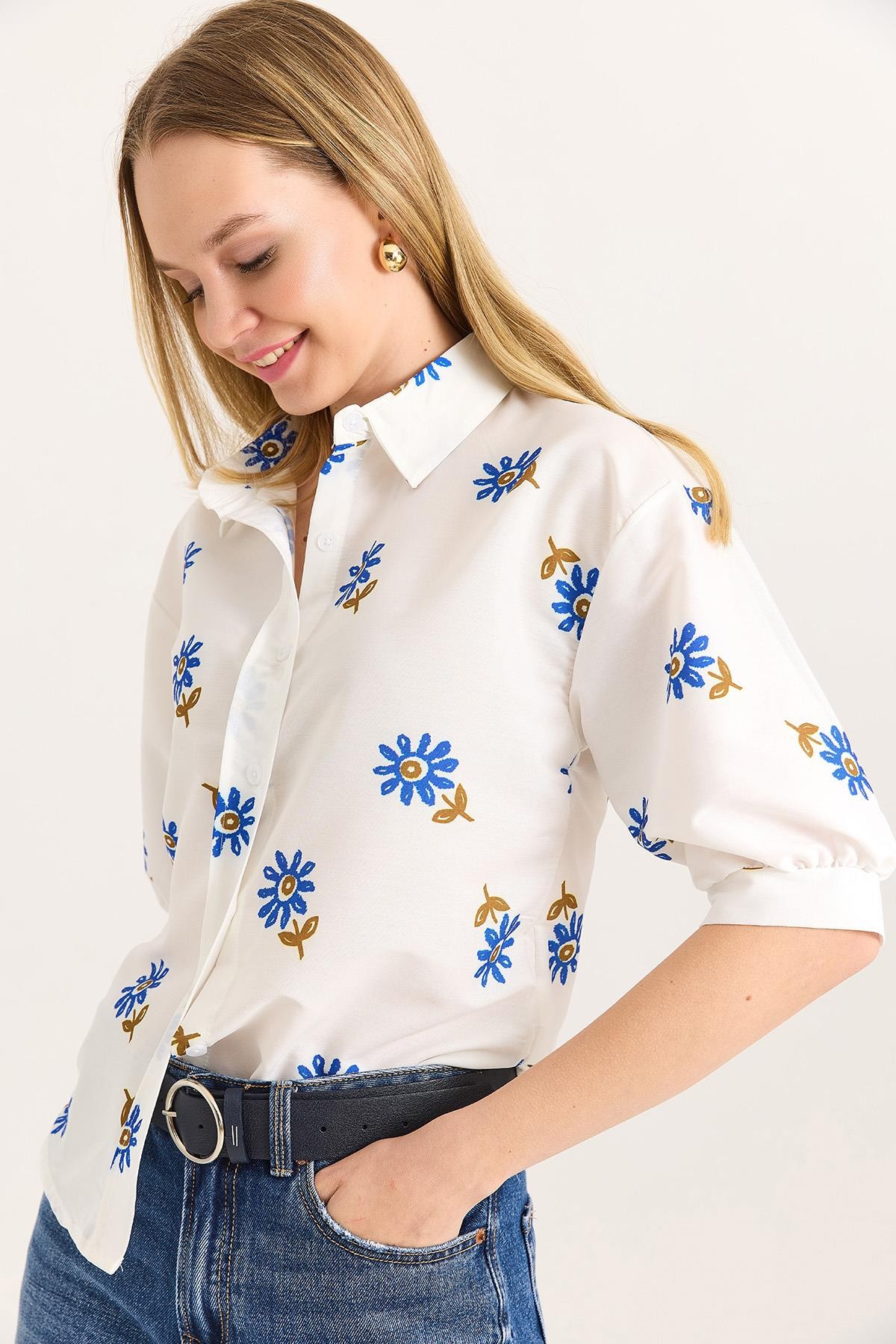 Balon Kol Desenli Kadın Gömlek Mavi Beyaz (251023GMLXMVİ)