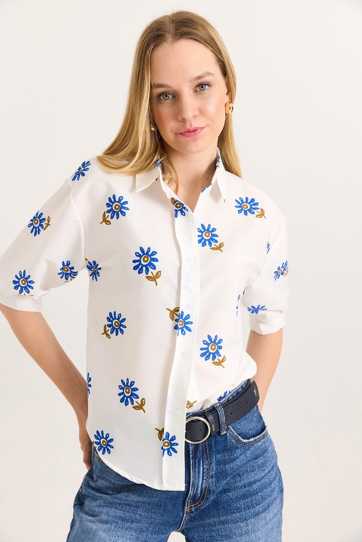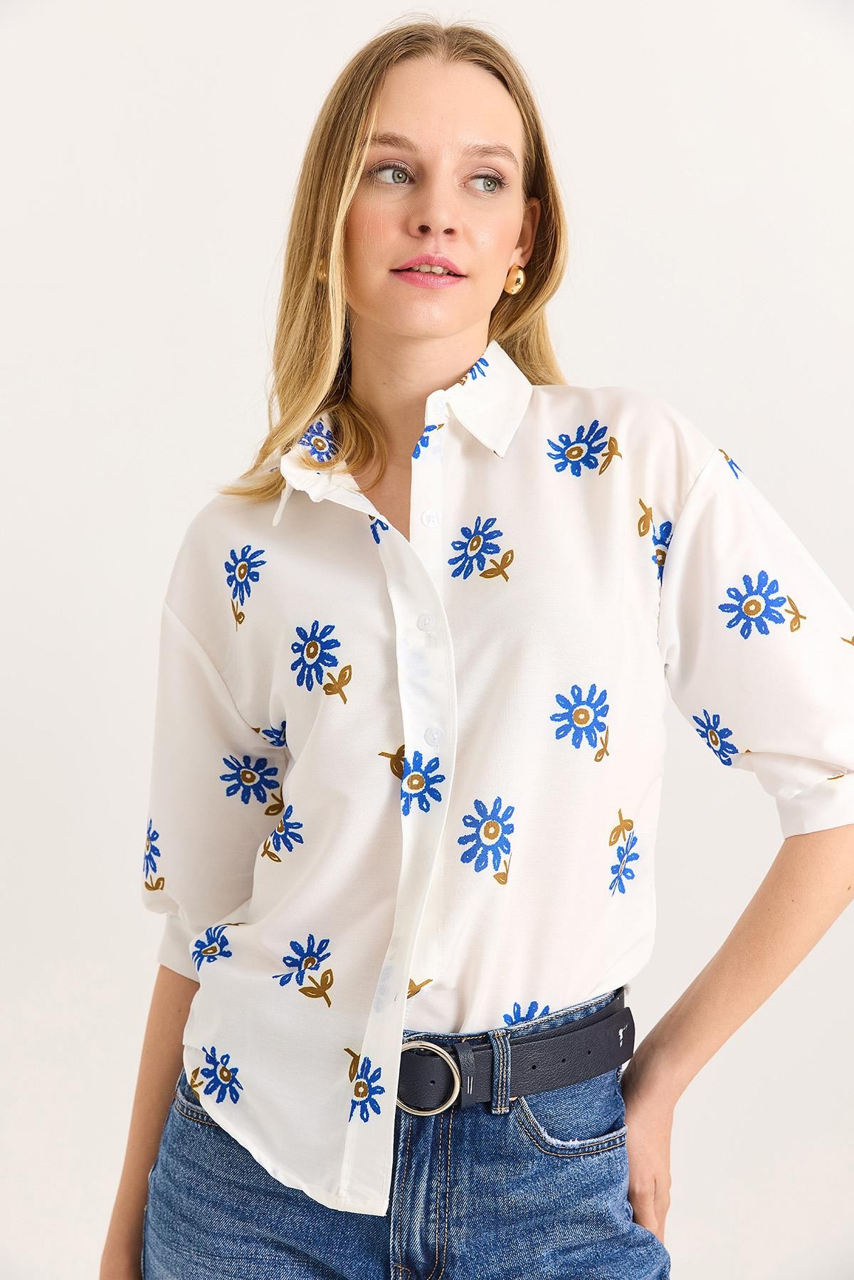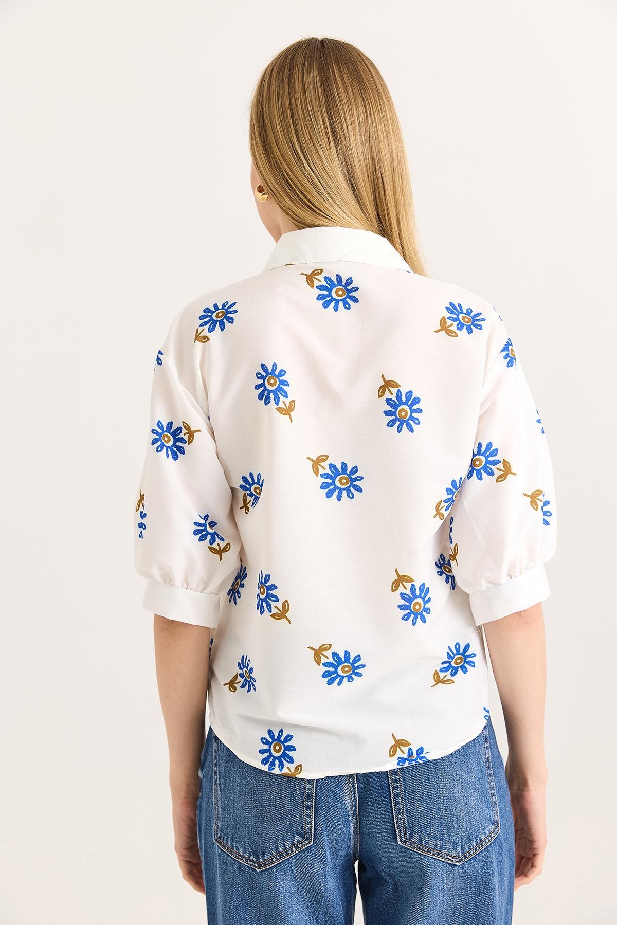 Balon Kol Desenli Kadın Gömlek Mavi Beyaz (251023GMLXMVİ)
