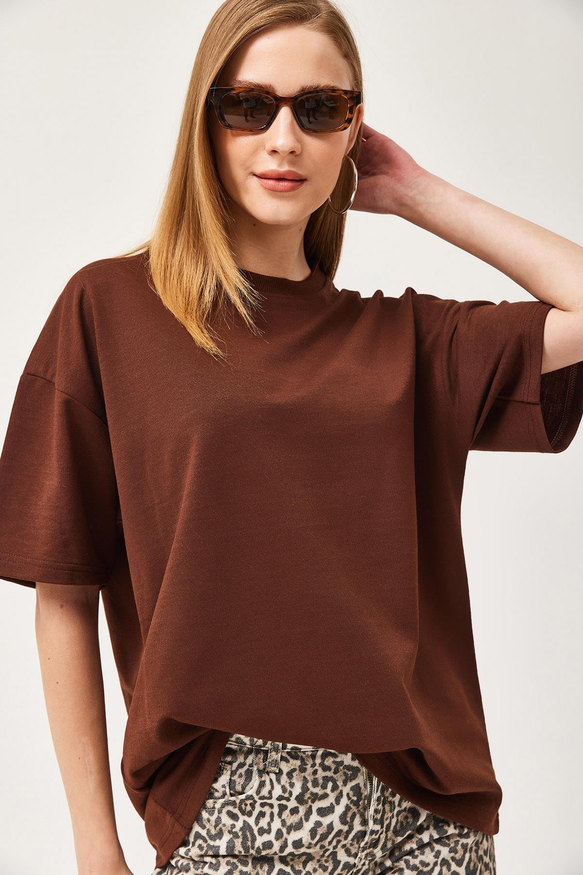 Basic Bisiklet Yaka Tshirt Kahverengi (250339TSHXKHV)