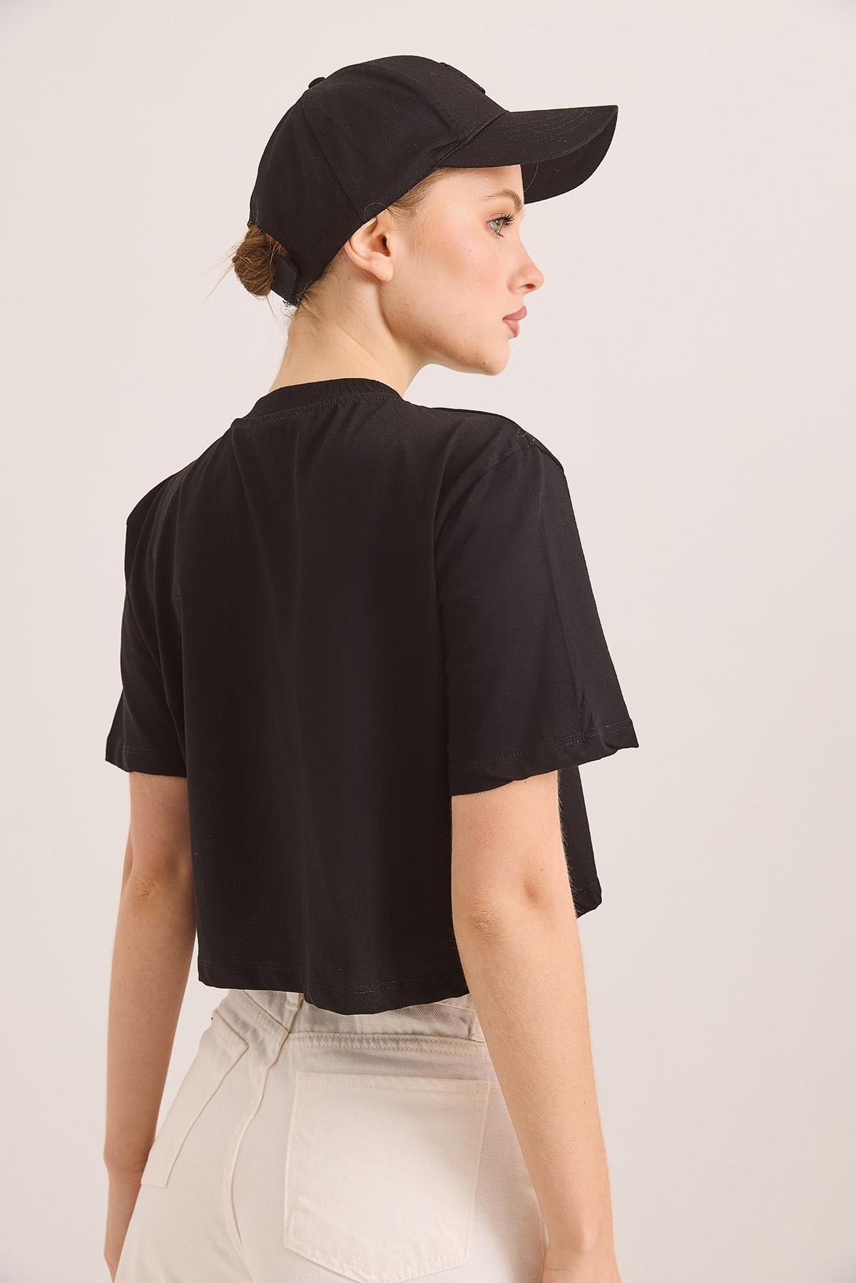 Baskılı Kısa Kol Pamuk Crop Tshirt Siyah (250725TSHXSYH)