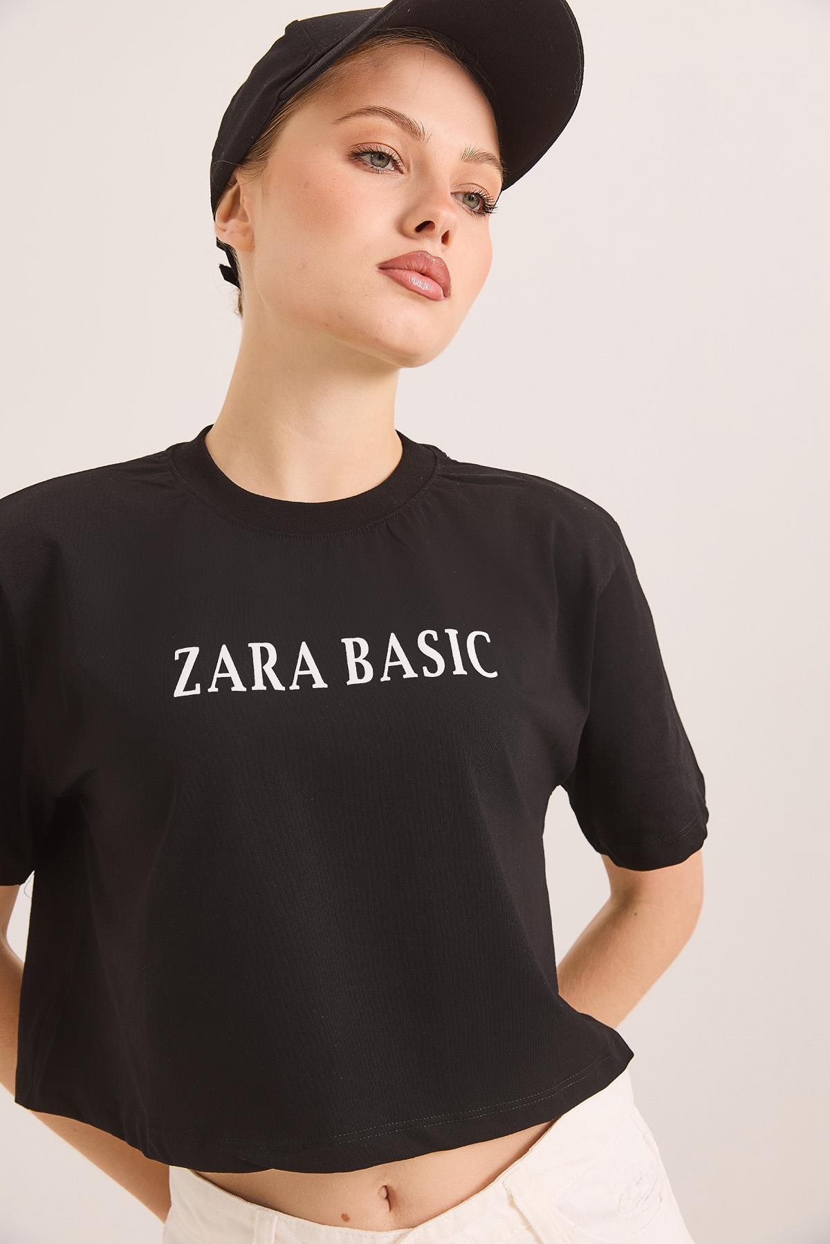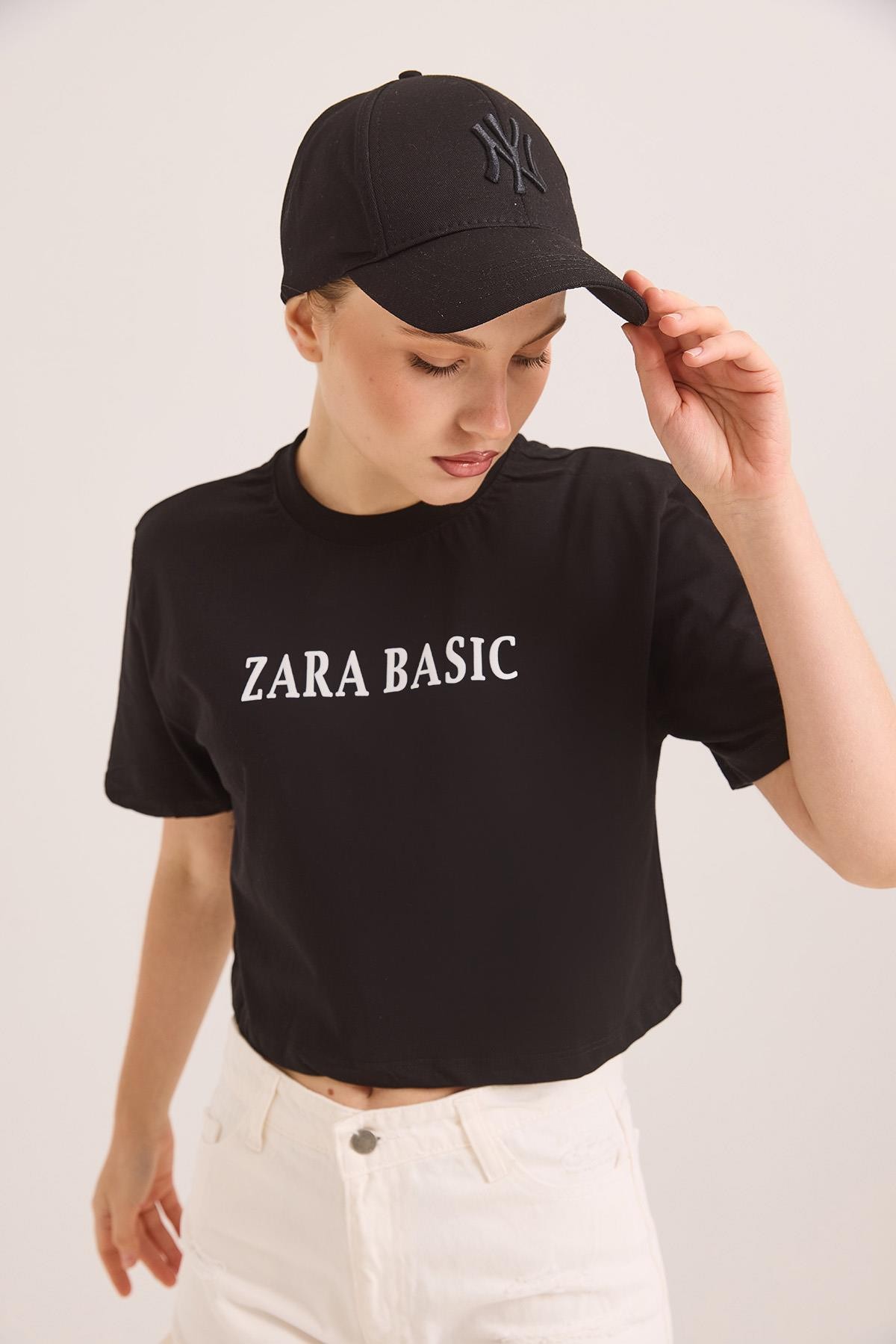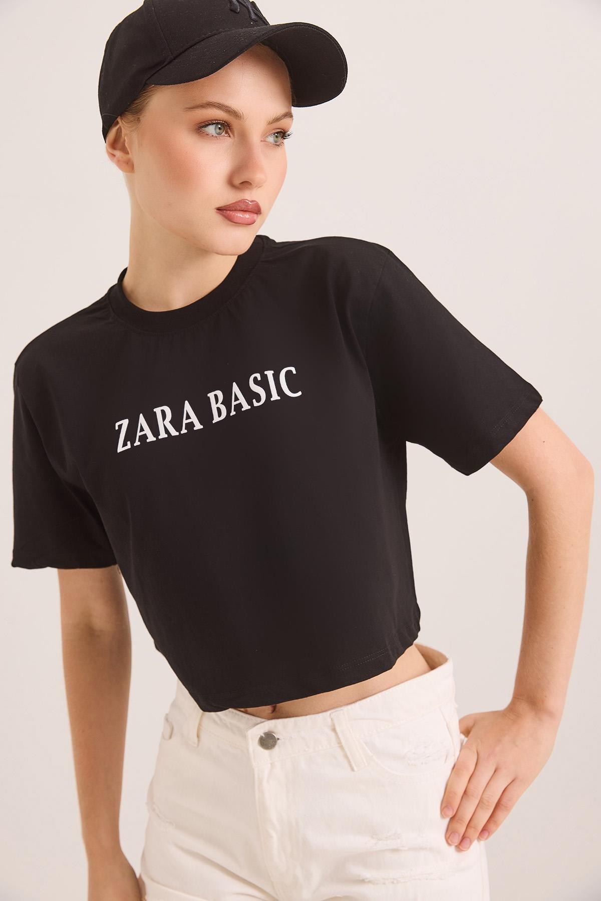 Baskılı Kısa Kol Pamuk Crop Tshirt Siyah