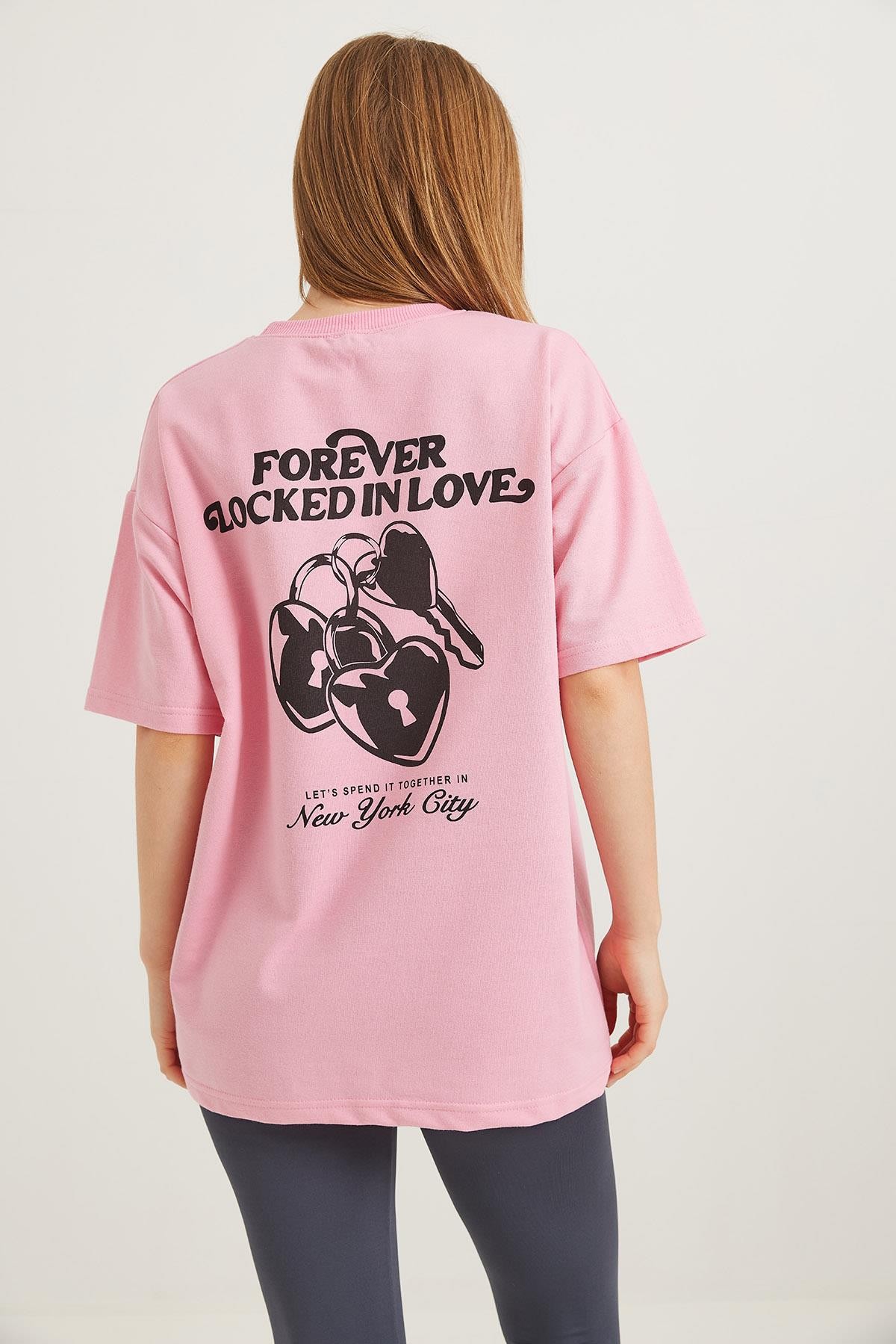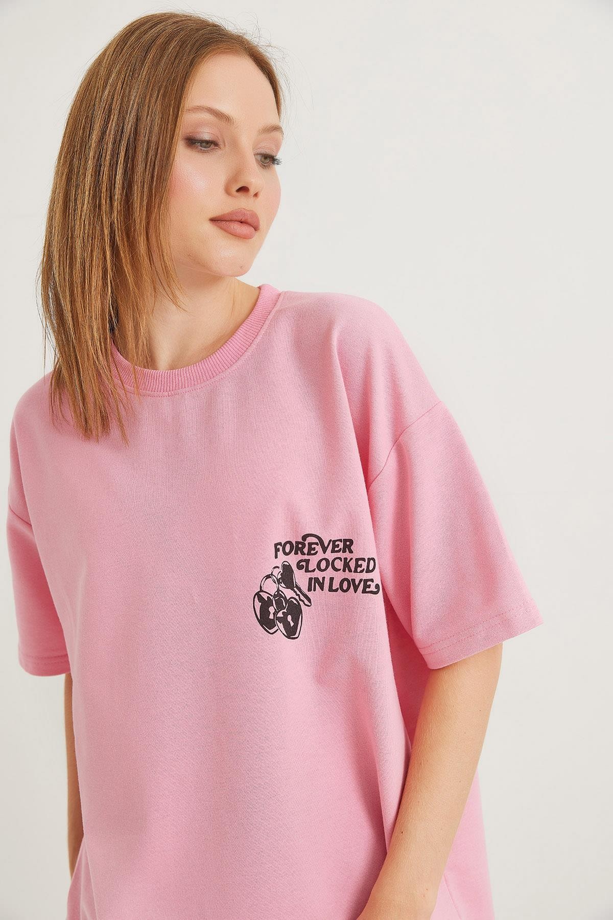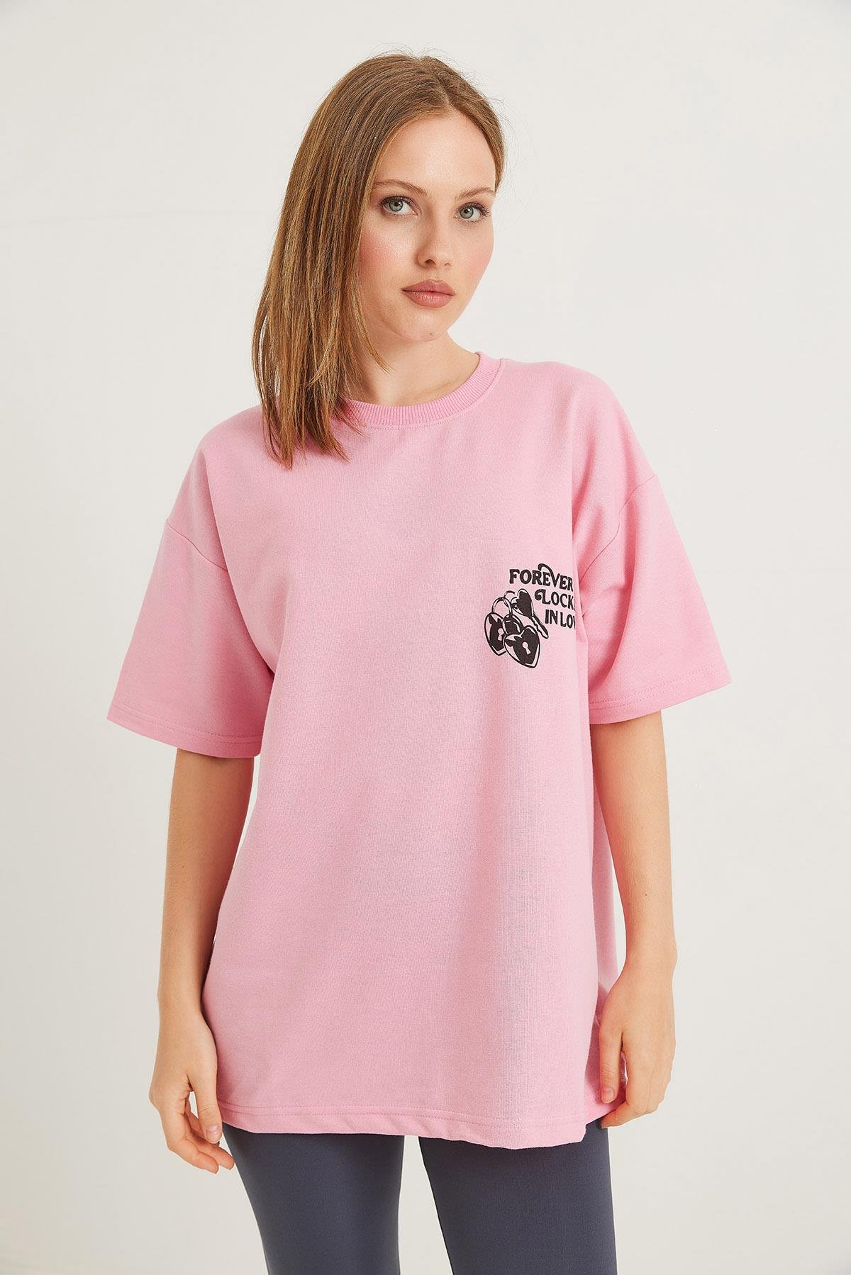 Baskılı Oversize İki İplik Tshirt Pembe (250688TSHXPMB)
