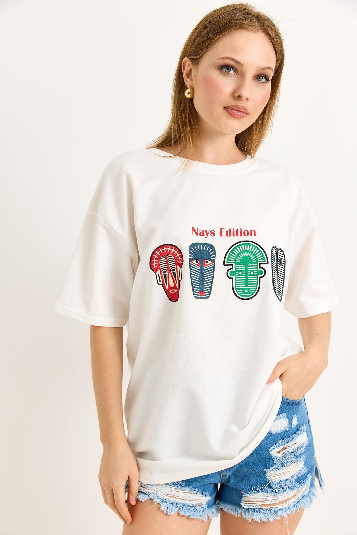 Baskılı Oversize Tshirt Beyaz