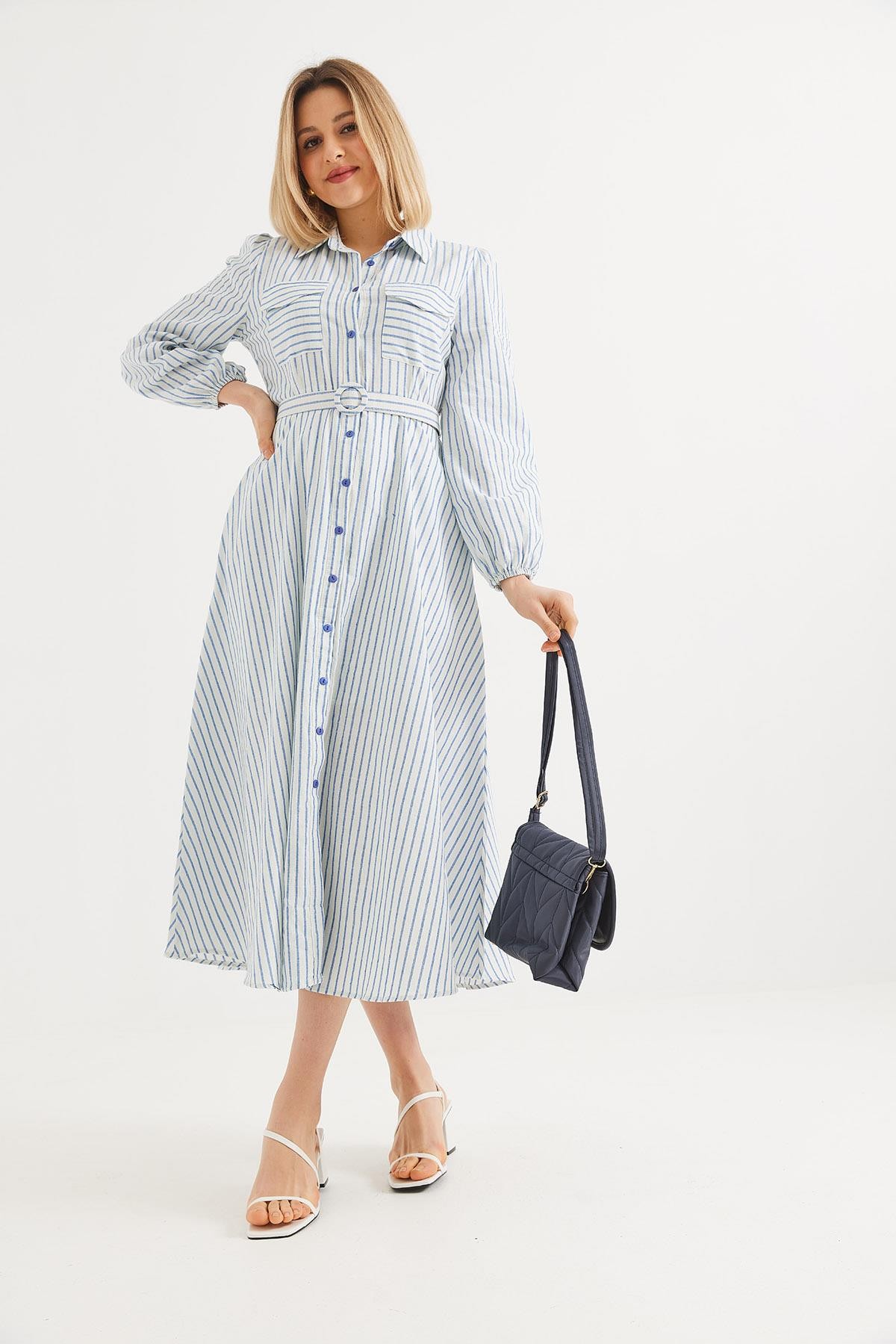 Belden Oturtmalı Çizgi Desenli Gömlek Elbise Mavi (250497ELBXMVİ)