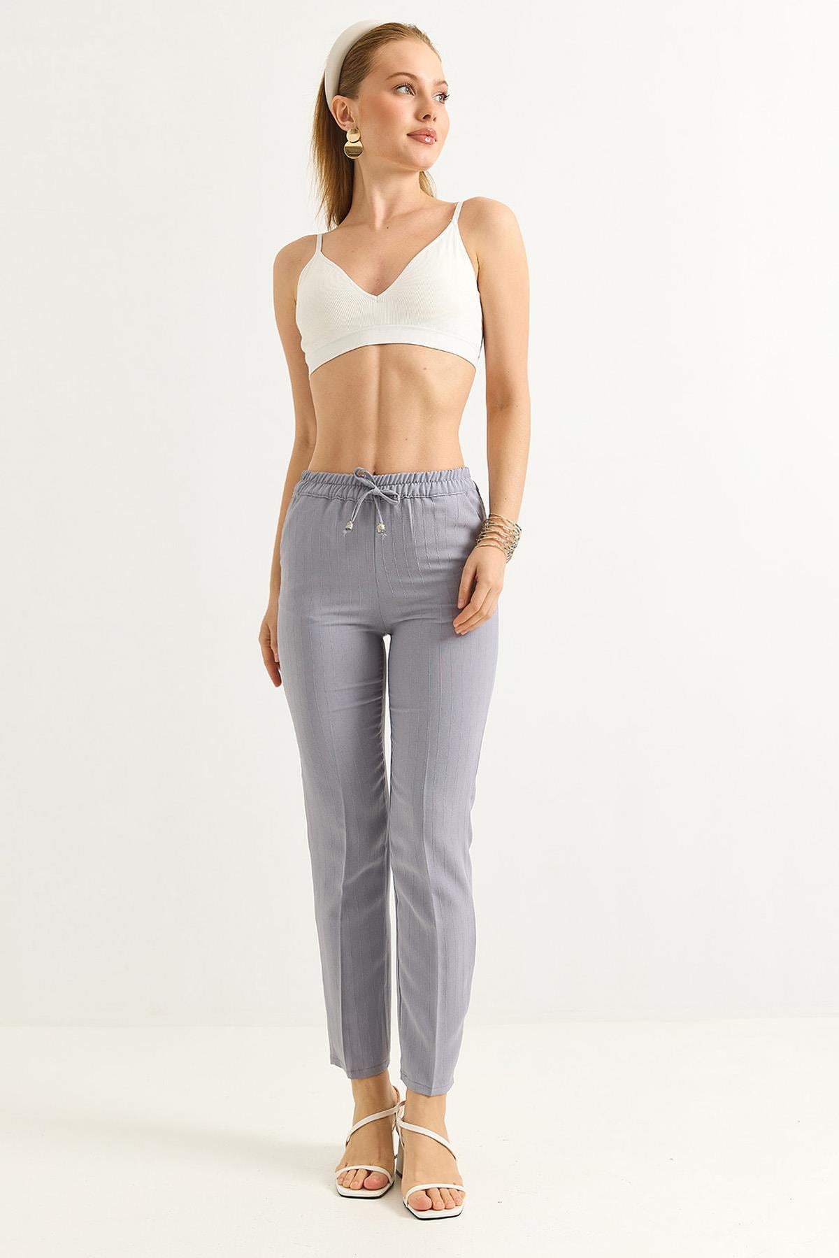 Beli Lastikli Çizgi Desenli Krep Pantolon Gri (251026PNTXGRİ)