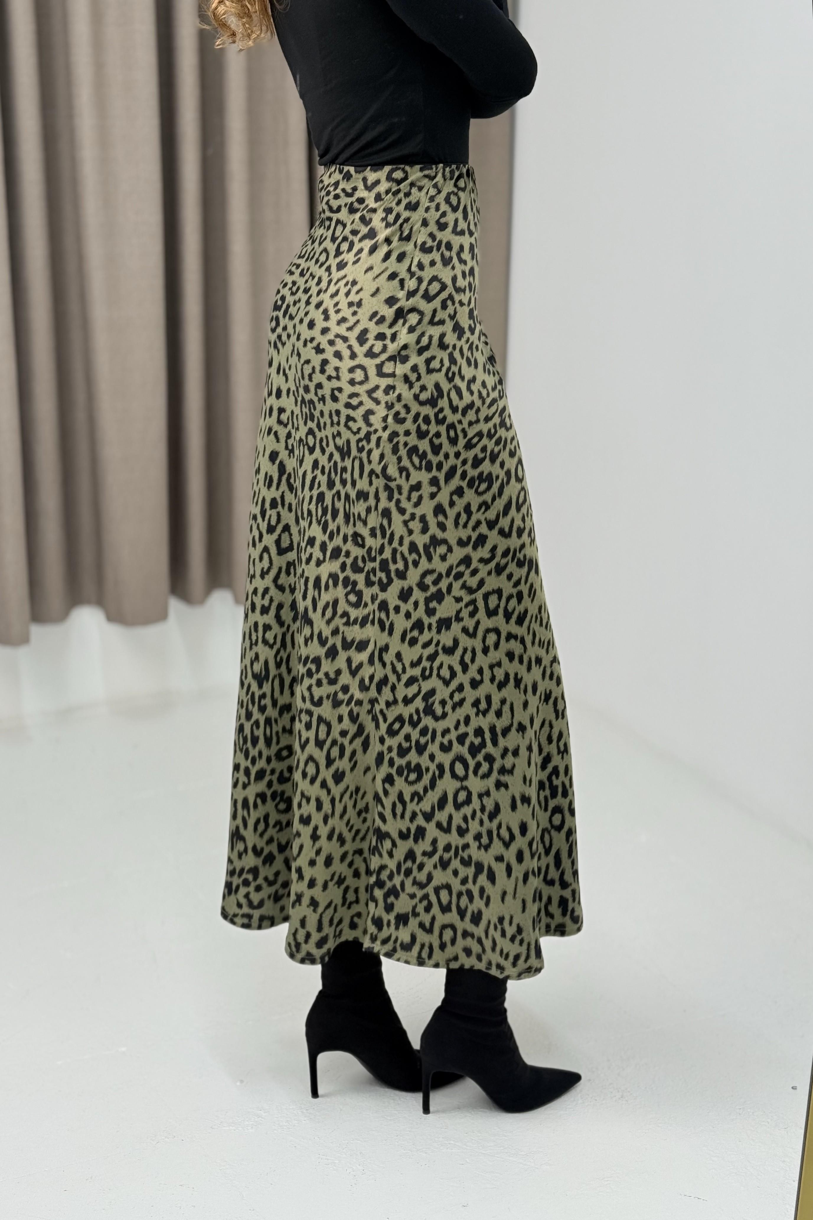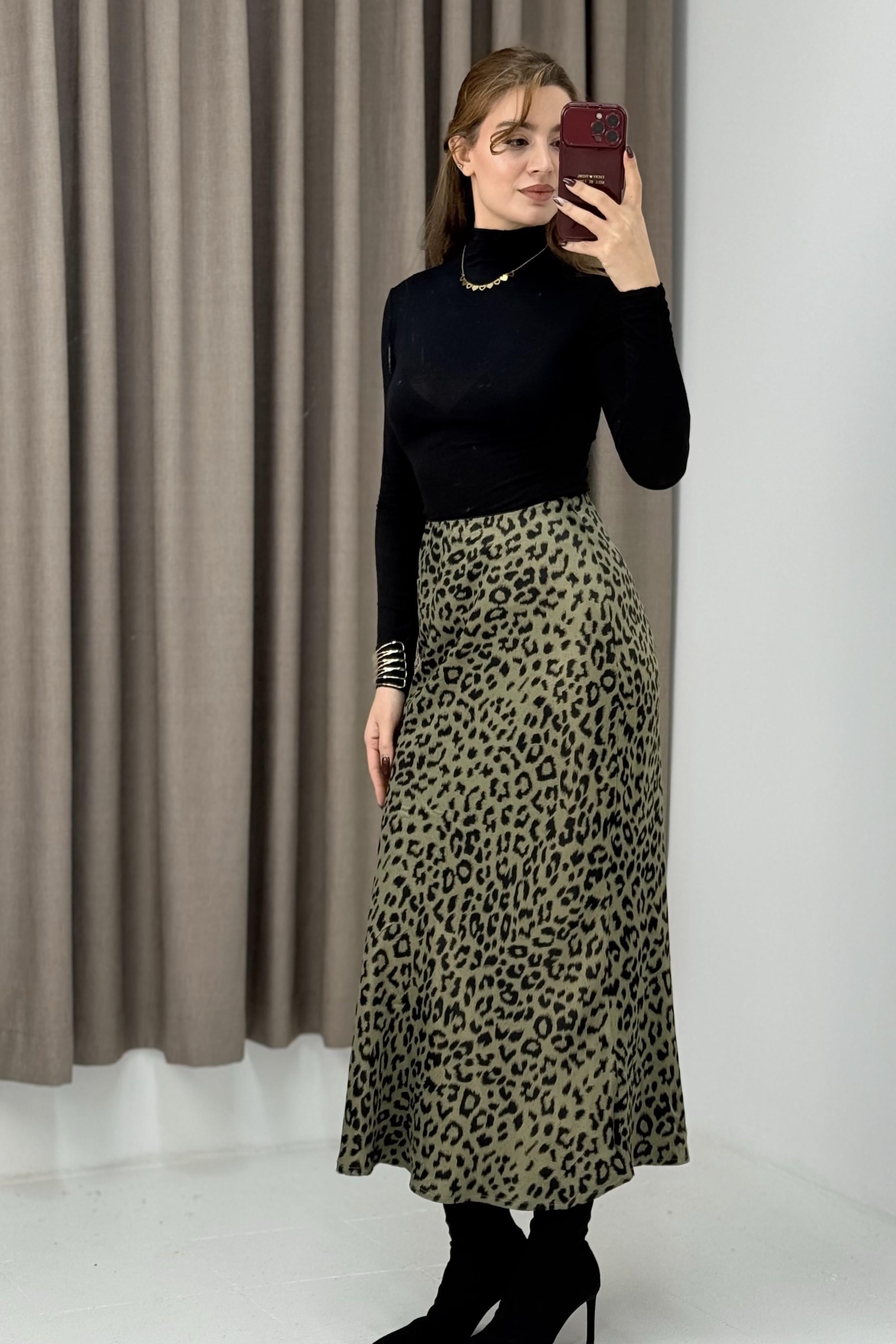 Beli Lastikli Leoparlı Saten Etek Haki (250672ETKXHKİ)