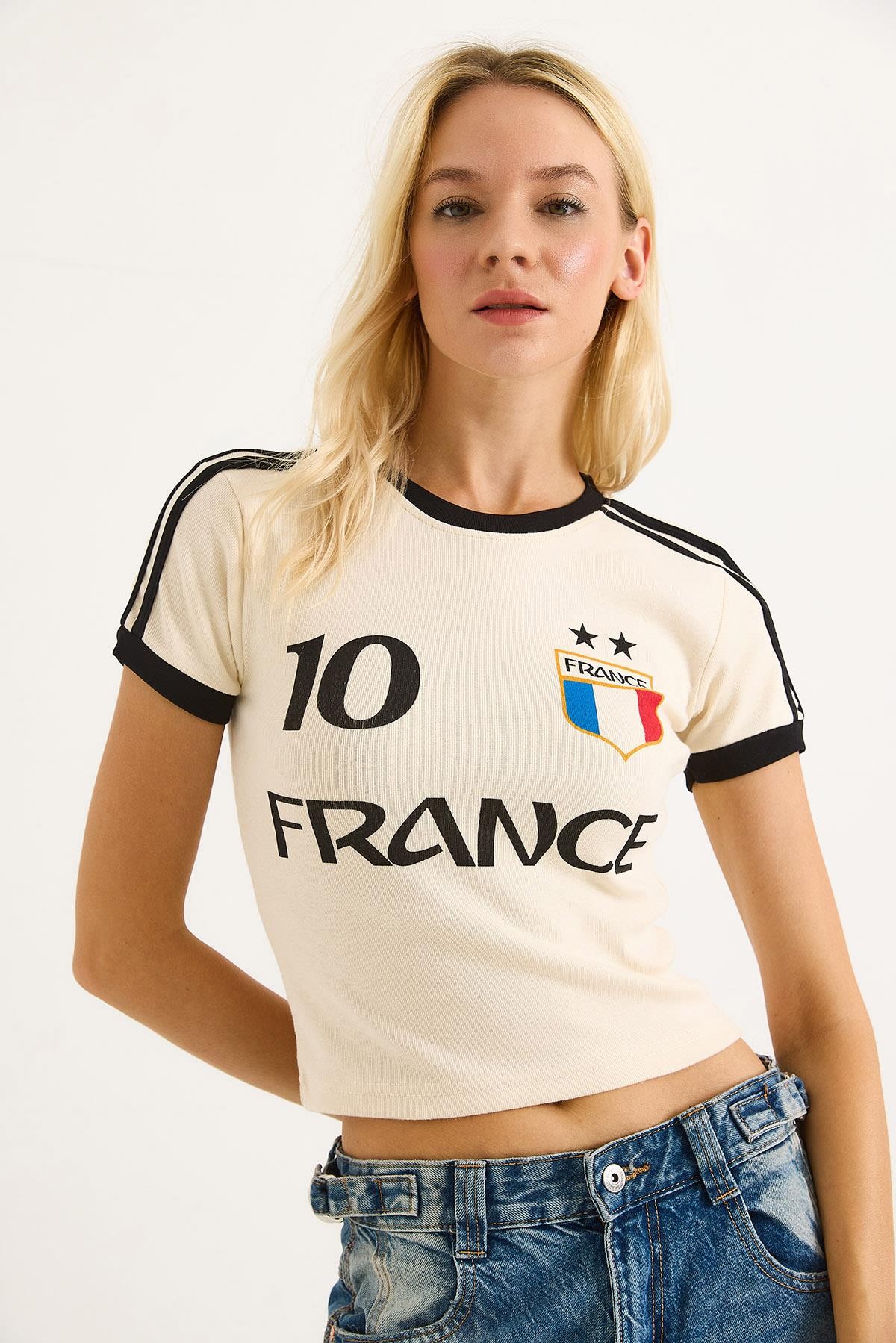 Bisiklet Yaka Baskılı Crop Tshirt Bej