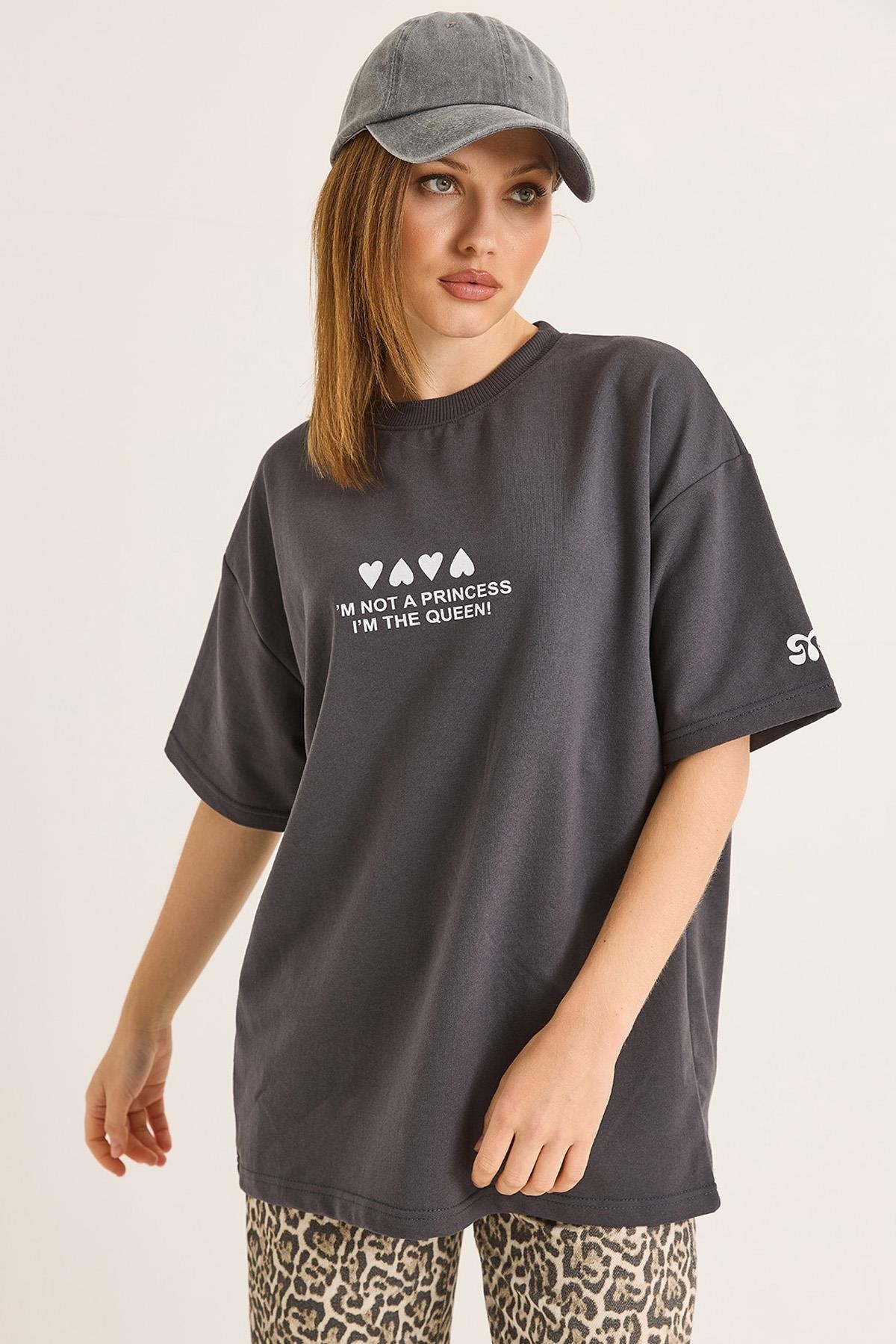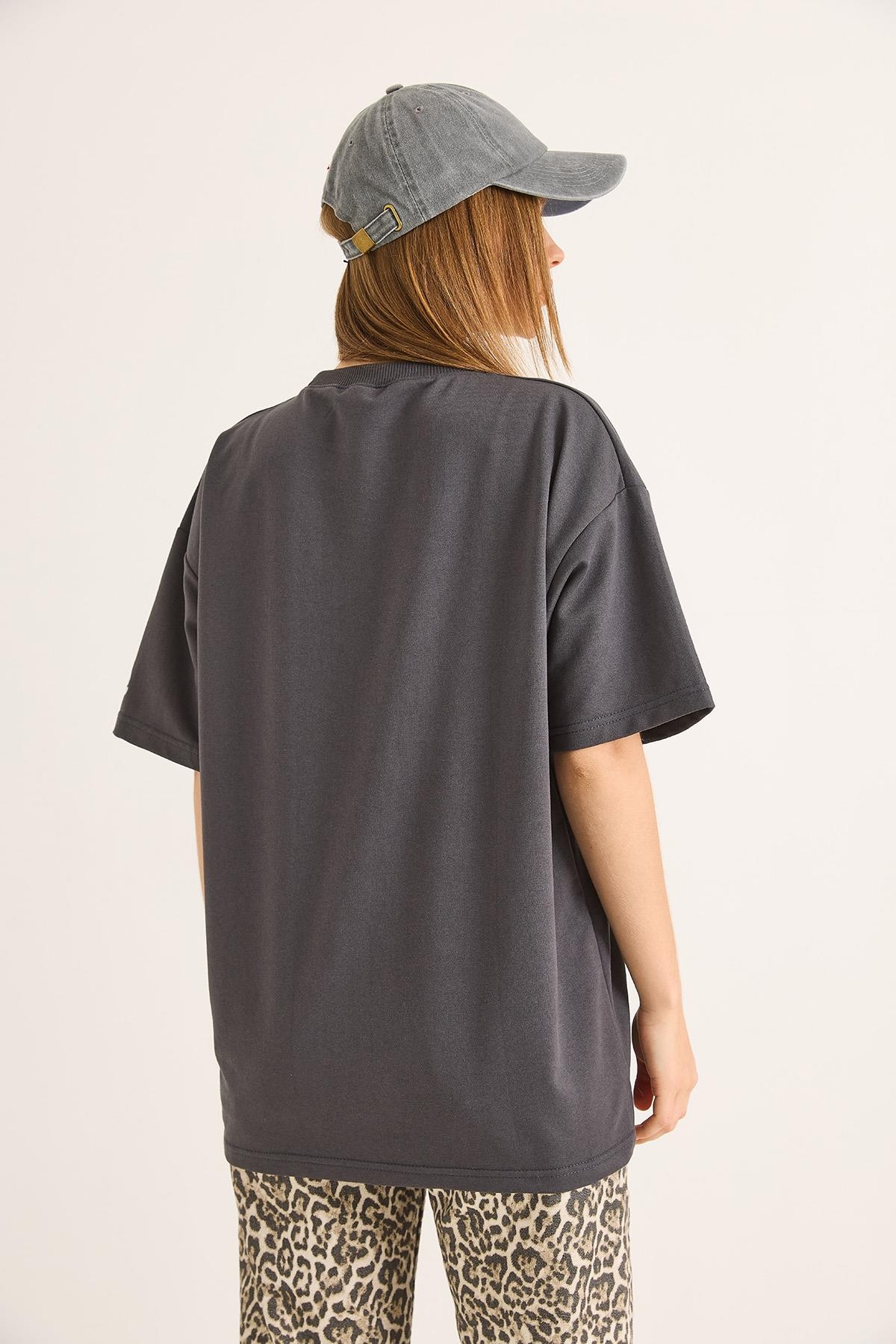 Bisiklet Yaka Baskılı Oversize Tshirt Füme (250718TSHXFME)