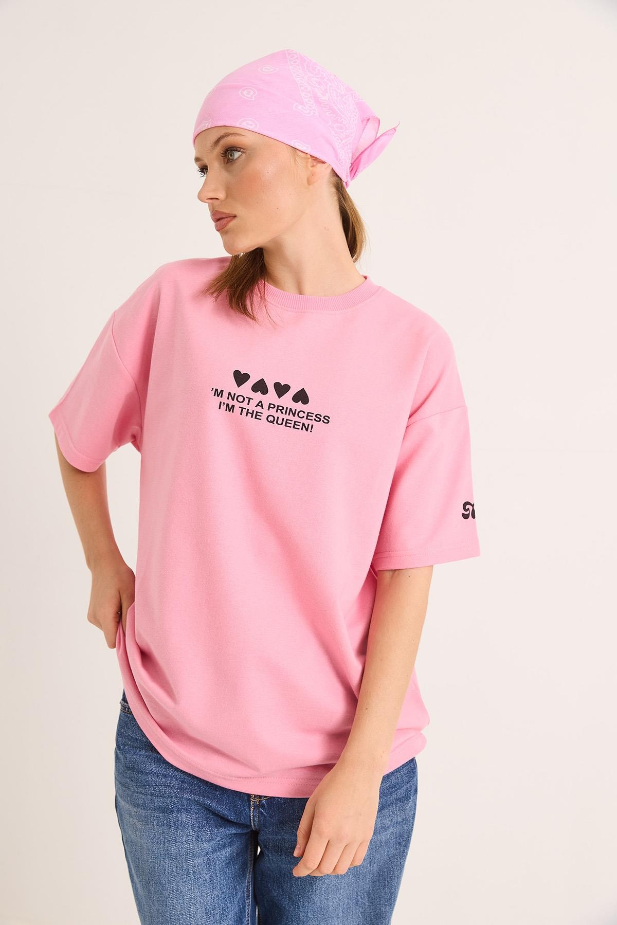 Bisiklet Yaka Baskılı Oversize Tshirt Pembe (250718TSHXPMB)