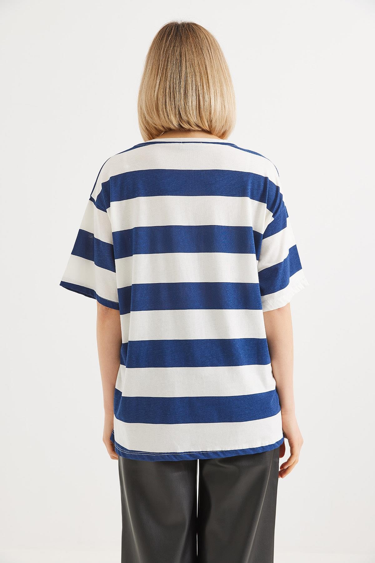 Bisiklet Yaka  Çizgili Basic Tshirt Lacivert