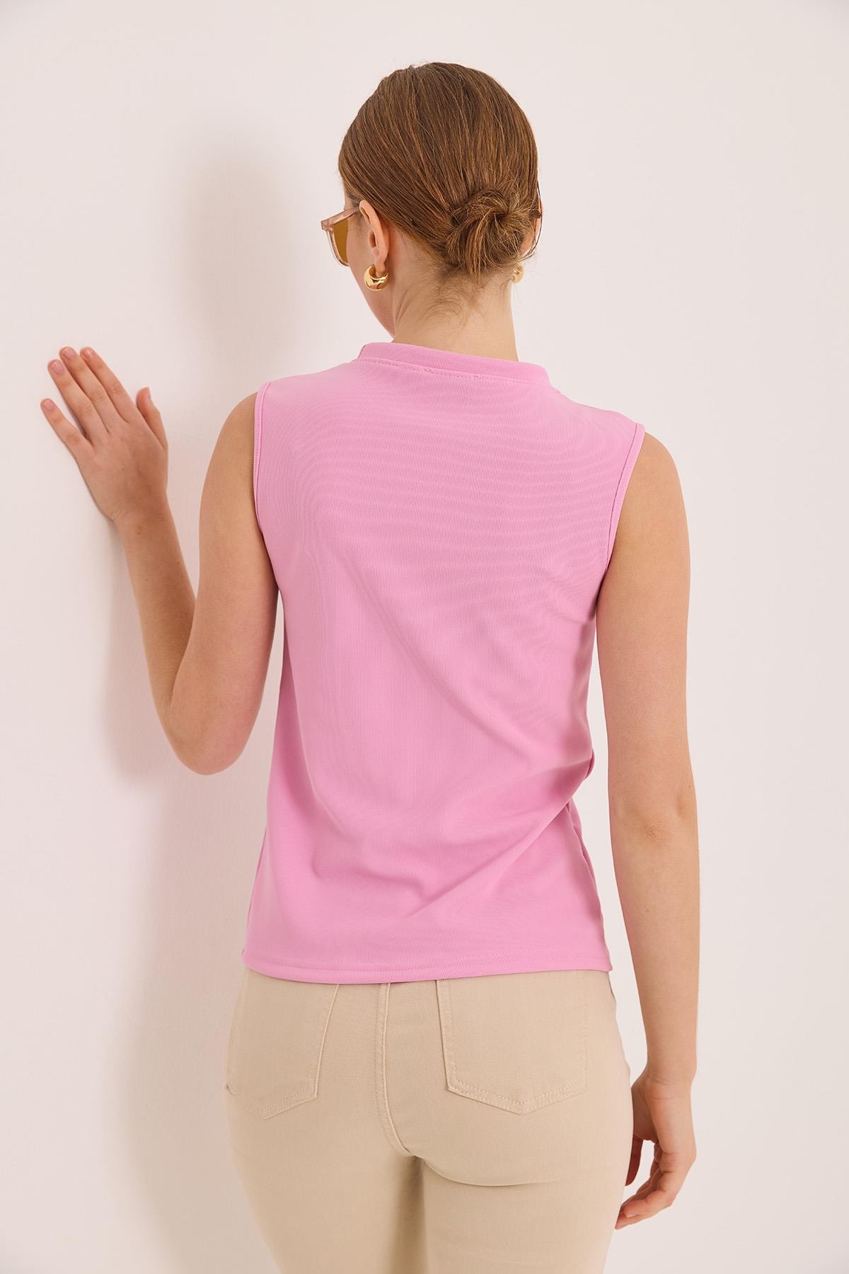 Bisiklet Yaka Gold Düğmeli Ottoman Fitilli Bluz Pembe (250731BLZXPMB)