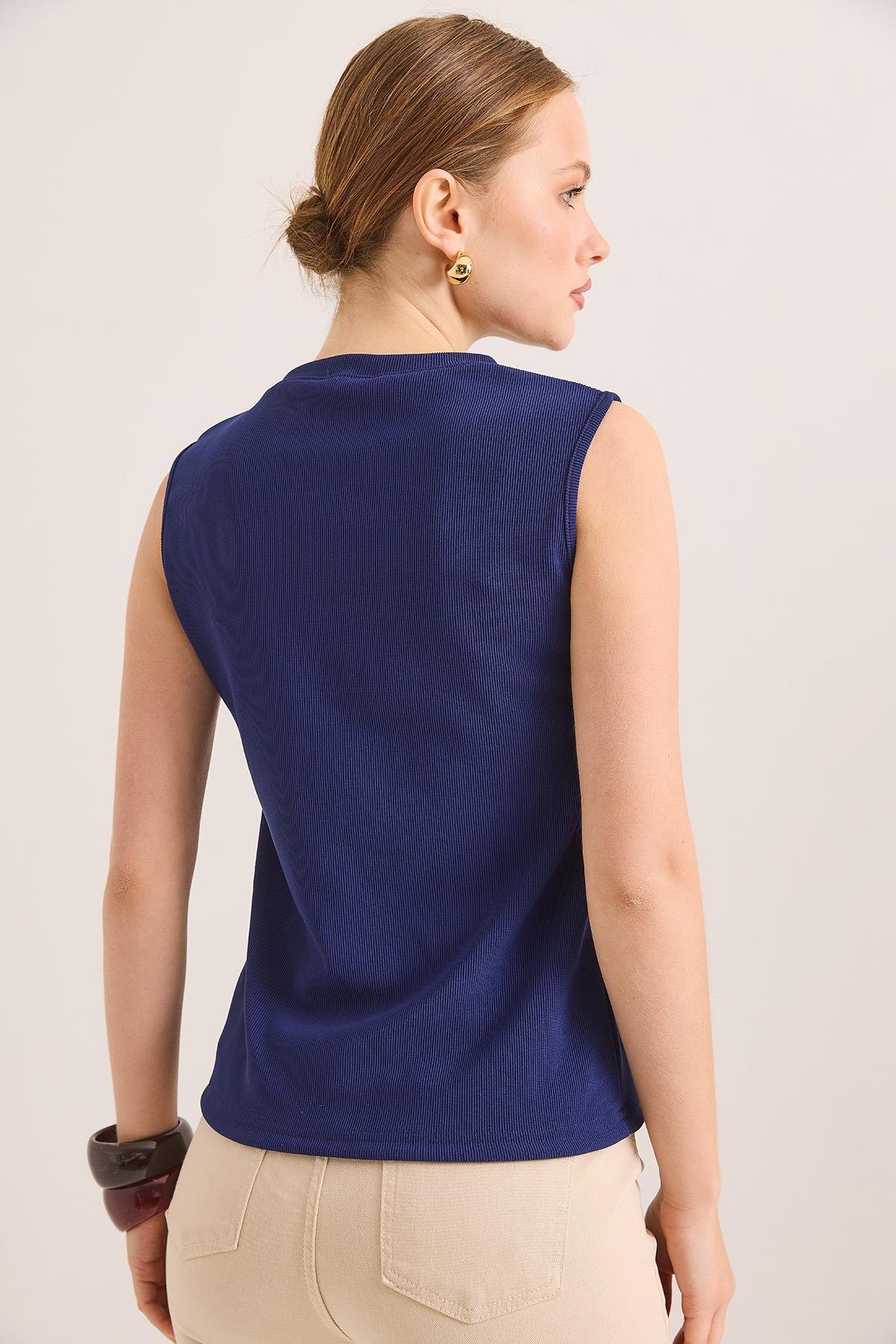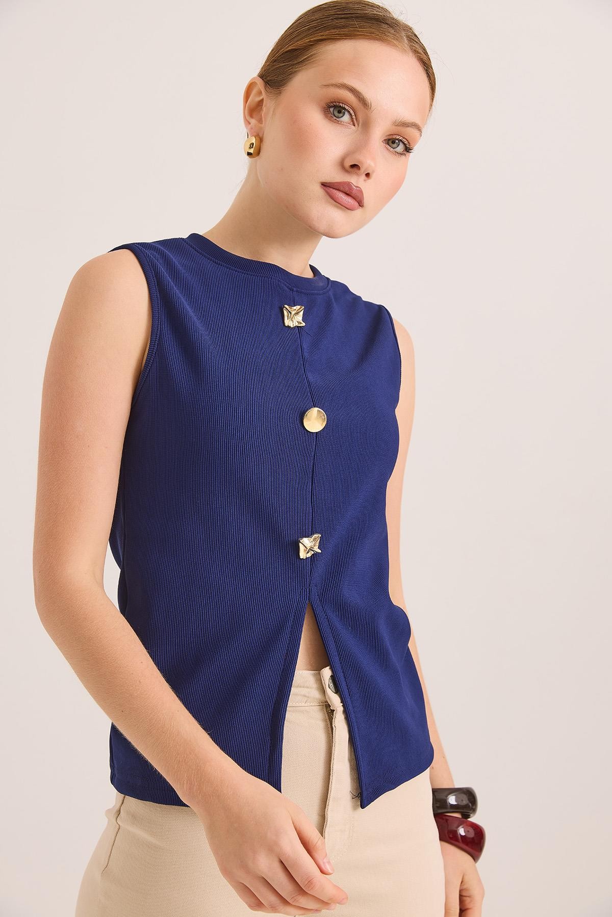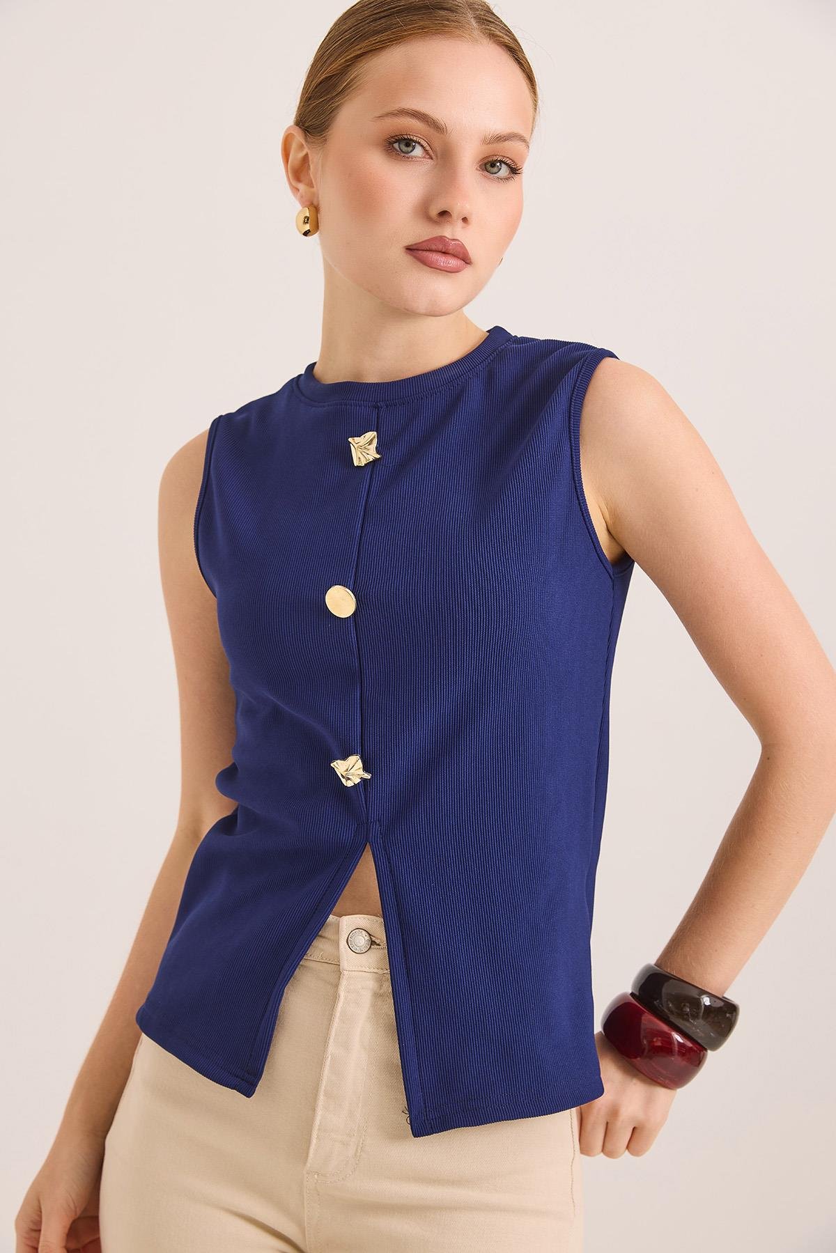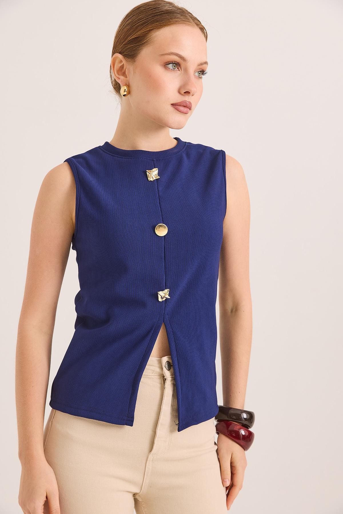 Bisiklet Yaka Gold Düğmeli Ottoman Fitilli Bluz Saks (250731BLZXSKS)