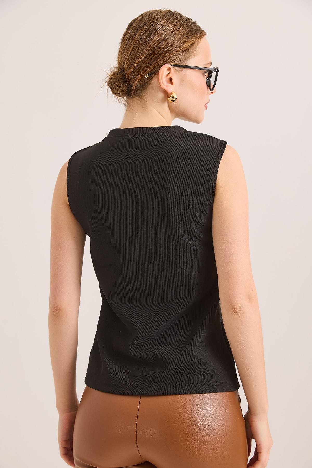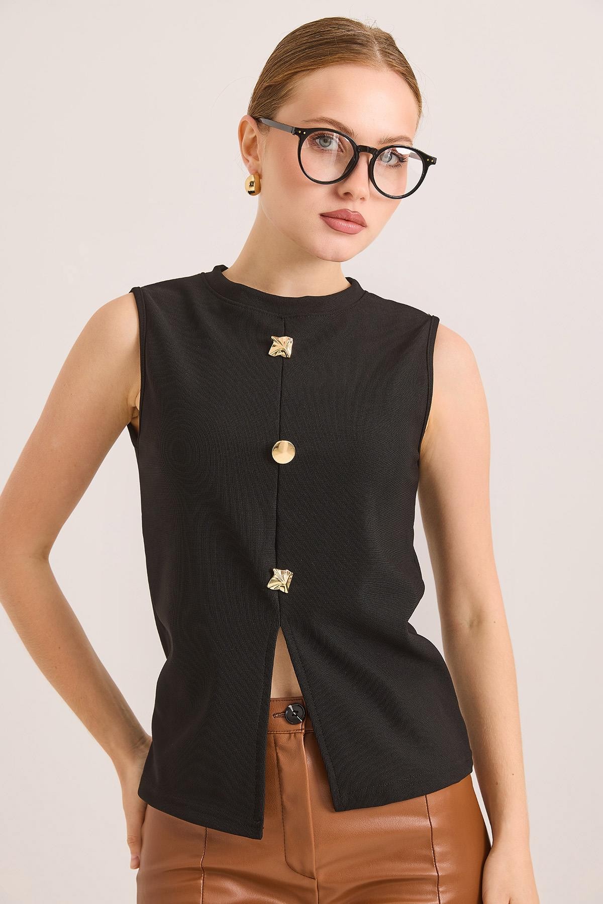 Bisiklet Yaka Gold Düğmeli Ottoman Fitilli Bluz Siyah (250731BLZXSYH)
