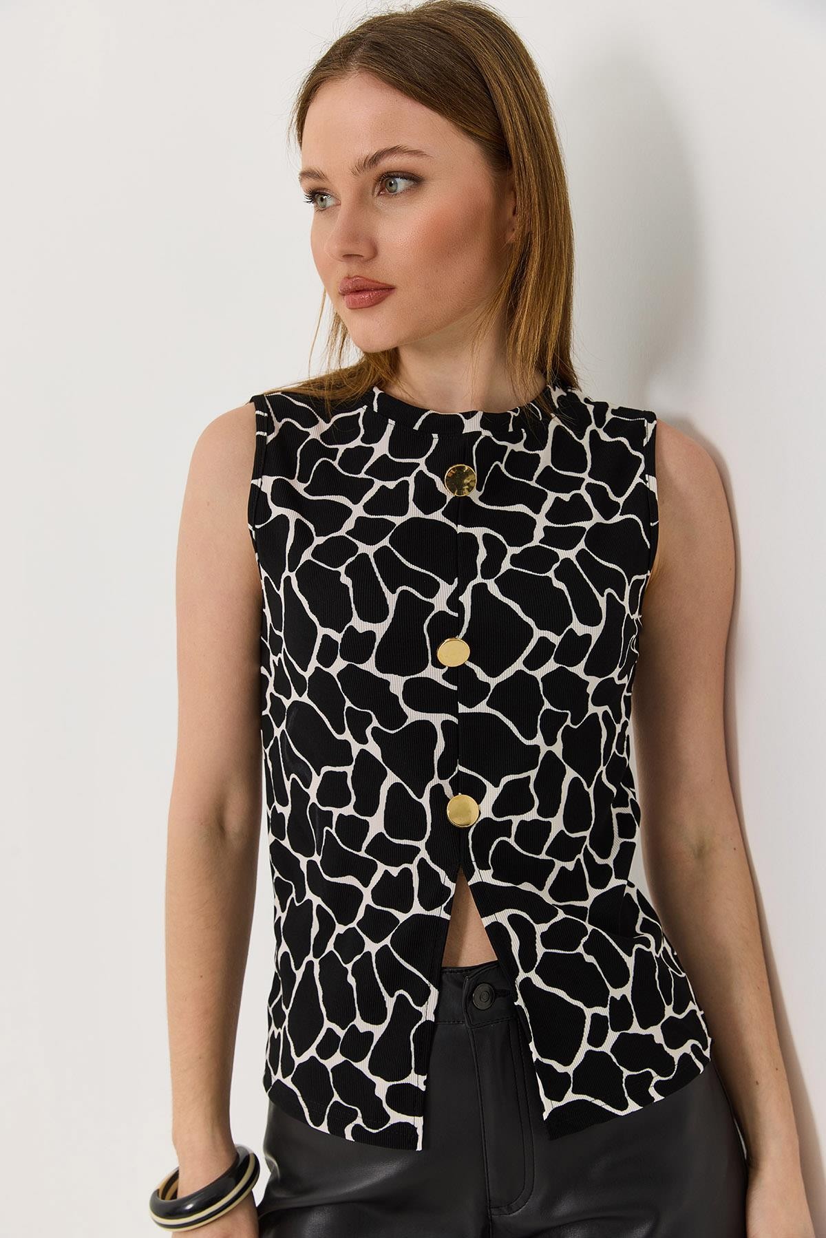 Bisiklet Yaka Gold Düğmeli Ottoman Fitilli Bluz Siyah (250731BLZXSYH1)