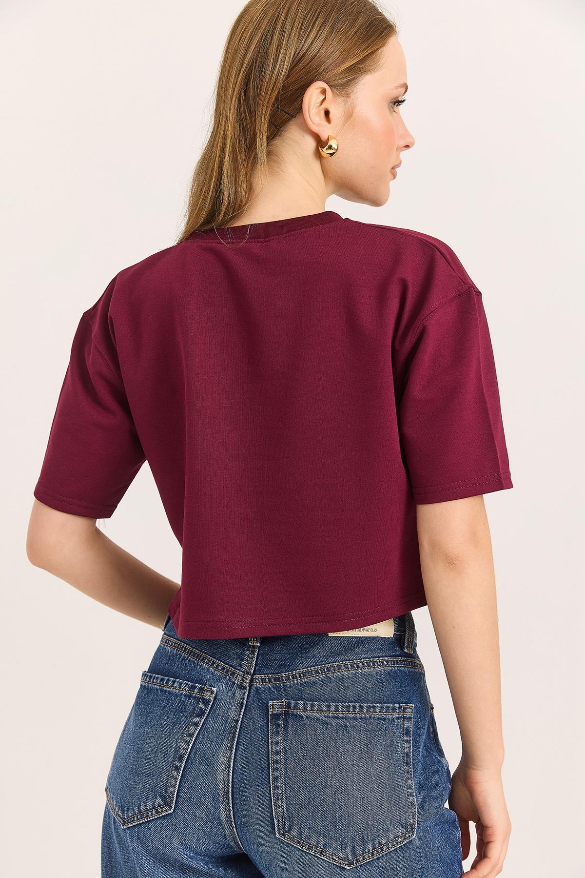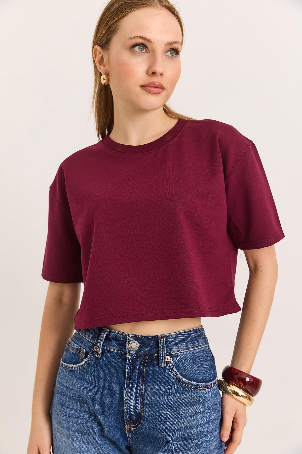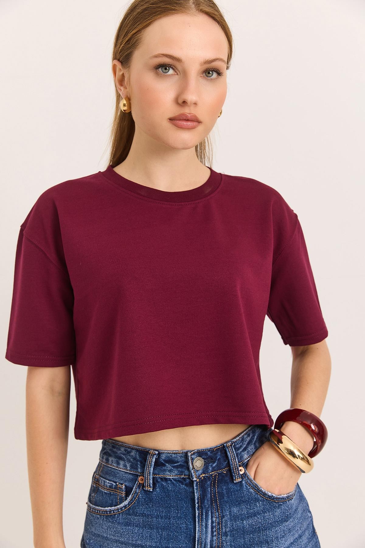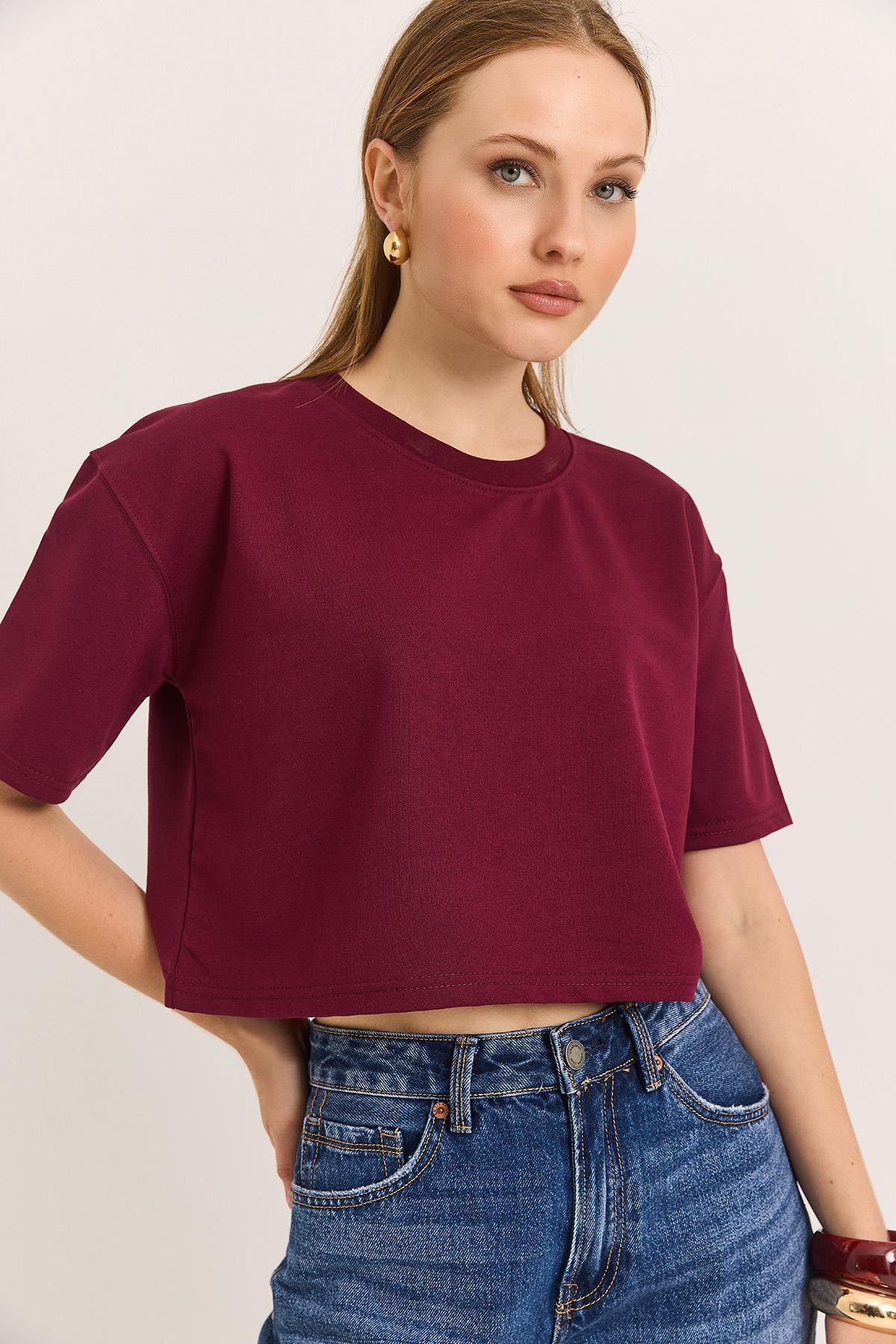 Bisiklet Yaka Havalı Crop İki İp Tshirt Bordo (500017CRPXBRD)
