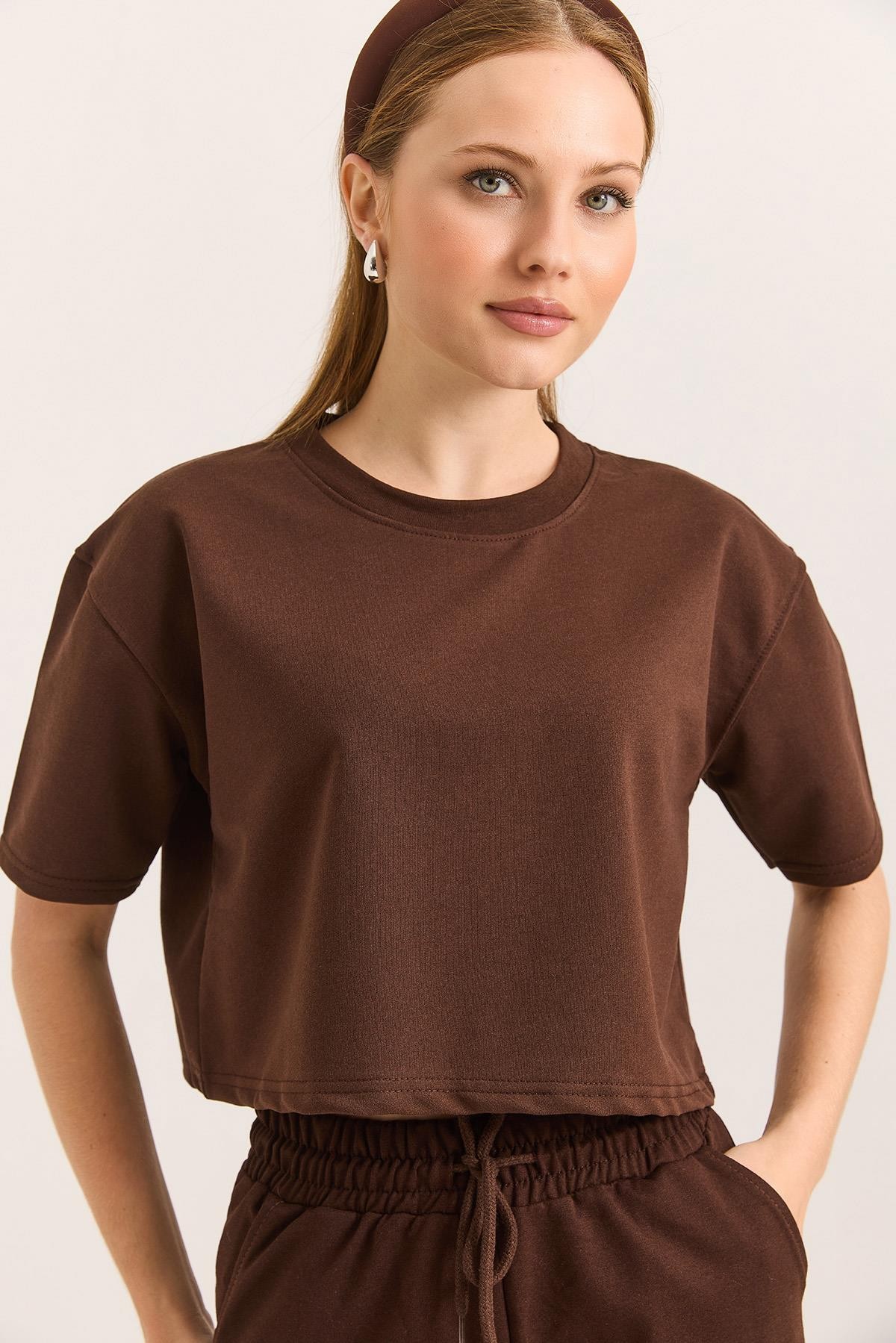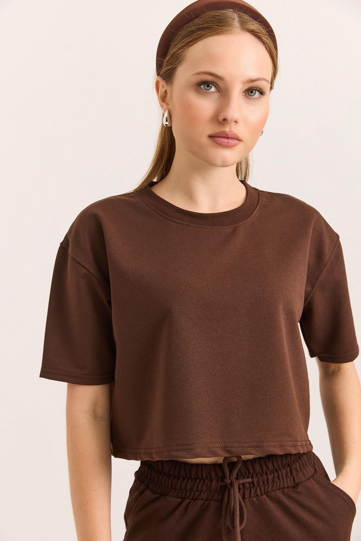 Bisiklet Yaka Havalı Crop İki İp Tshirt Kahverengi (500017CRPXKHV)
