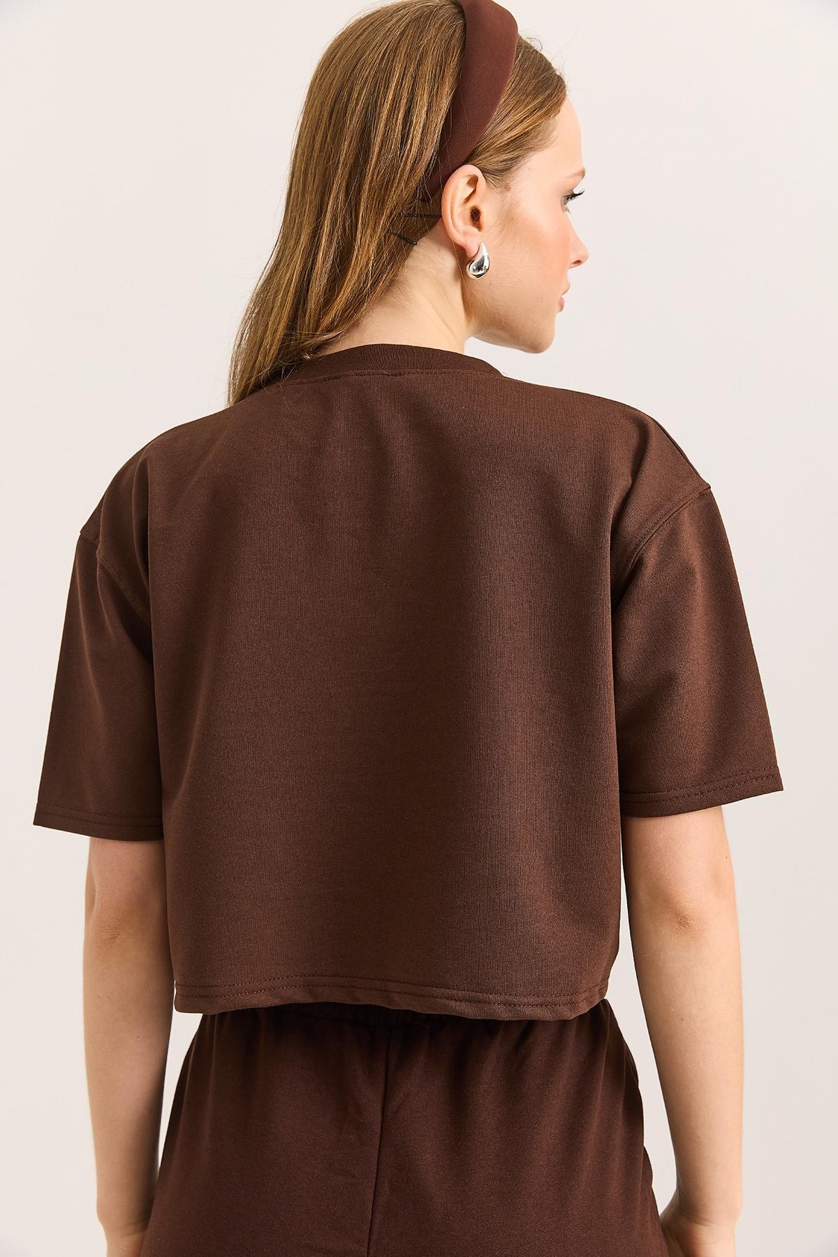 Bisiklet Yaka Havalı Crop İki İp Tshirt  Kahverengi