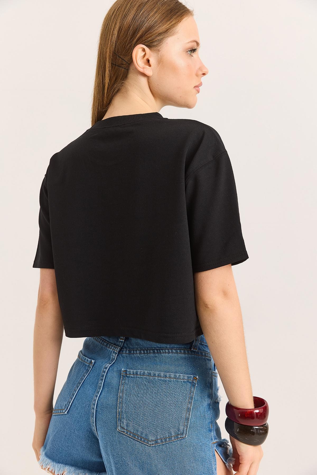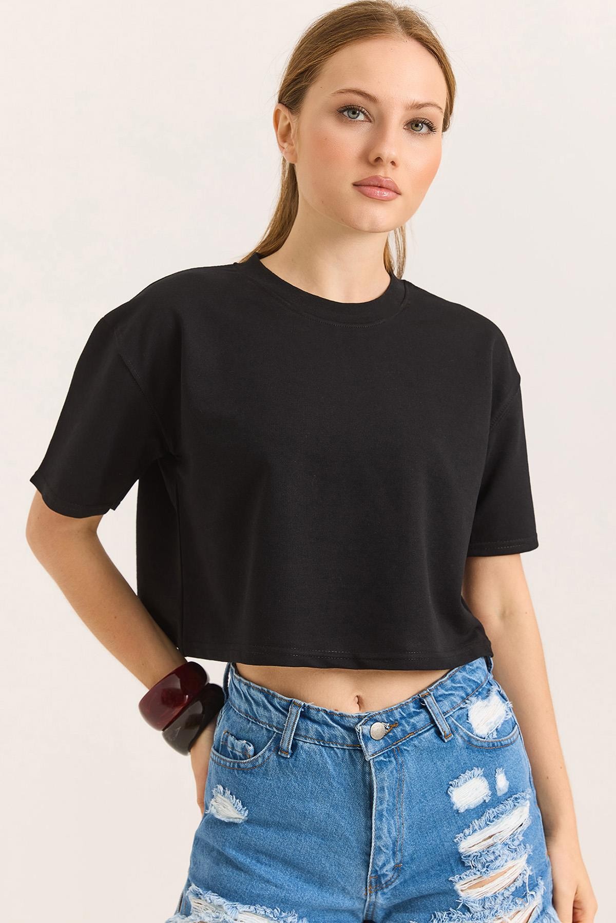 Bisiklet Yaka Havalı Crop İki İp Tshirt Siyah (500017CRPXSYH)