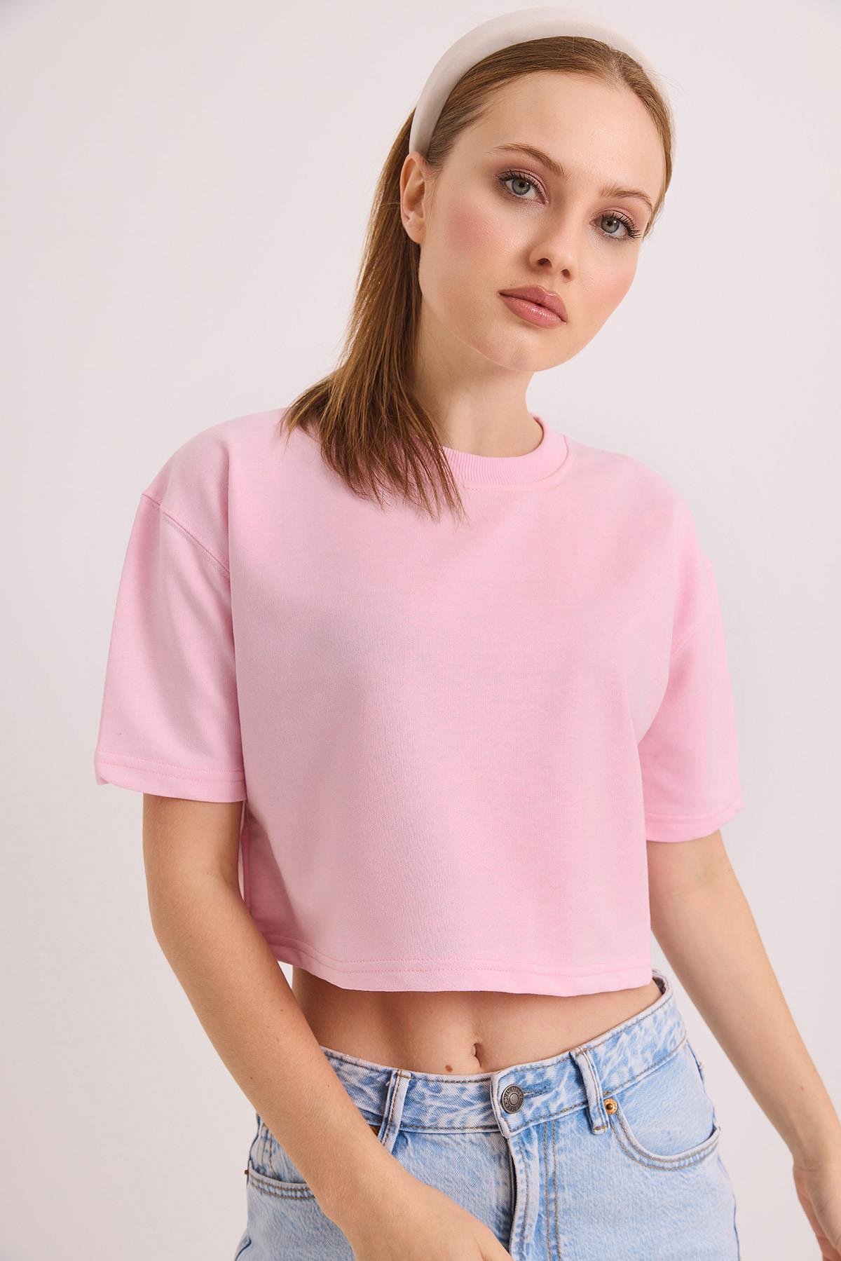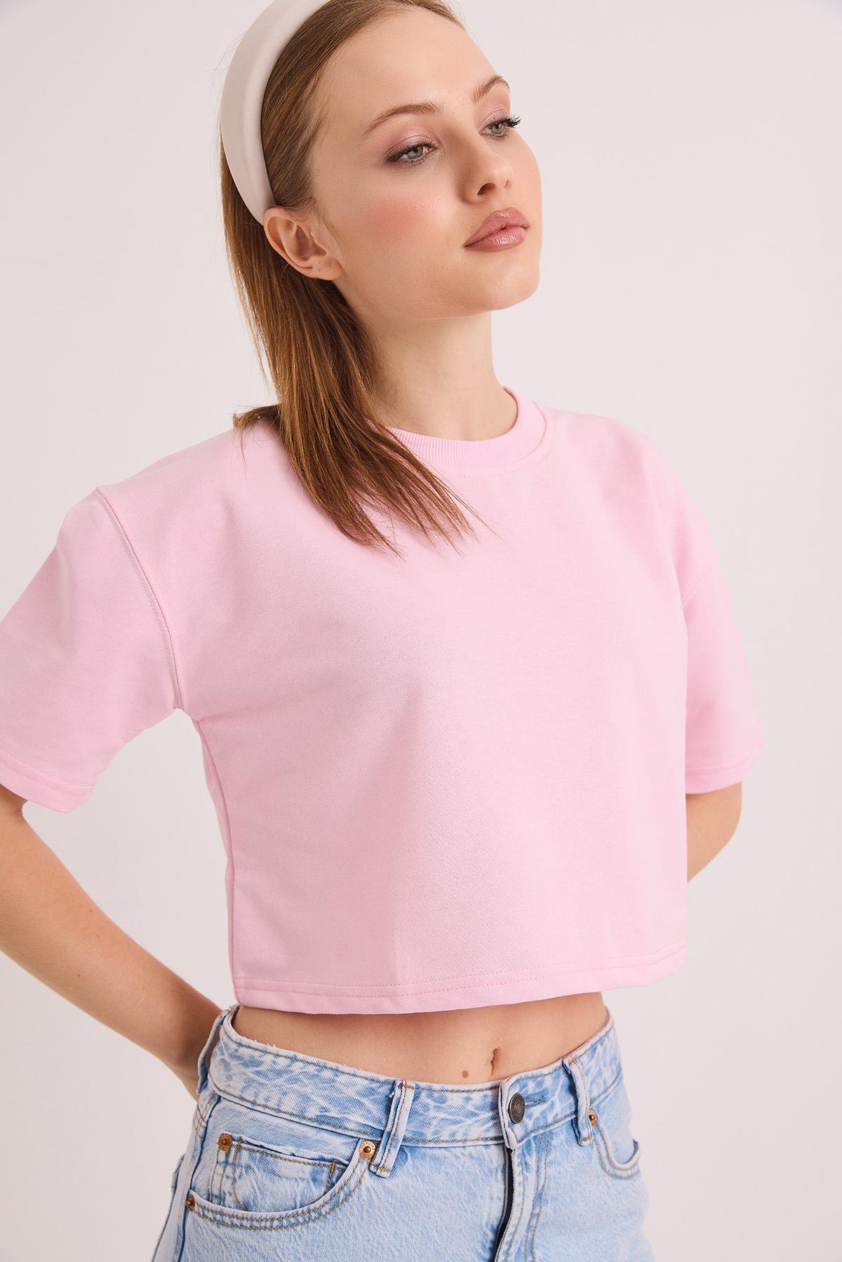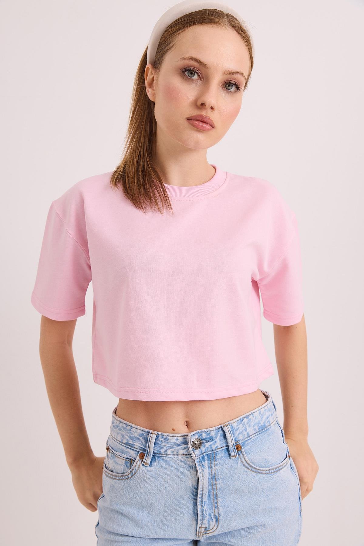 Bisiklet Yaka İki İplik Crop Bluz Açık Pembe (250862BLZXAPMB)