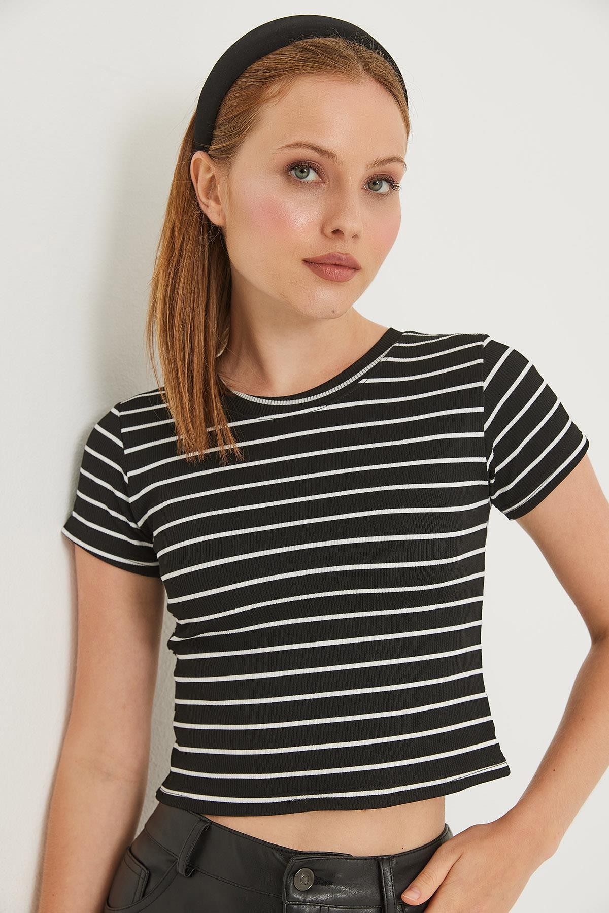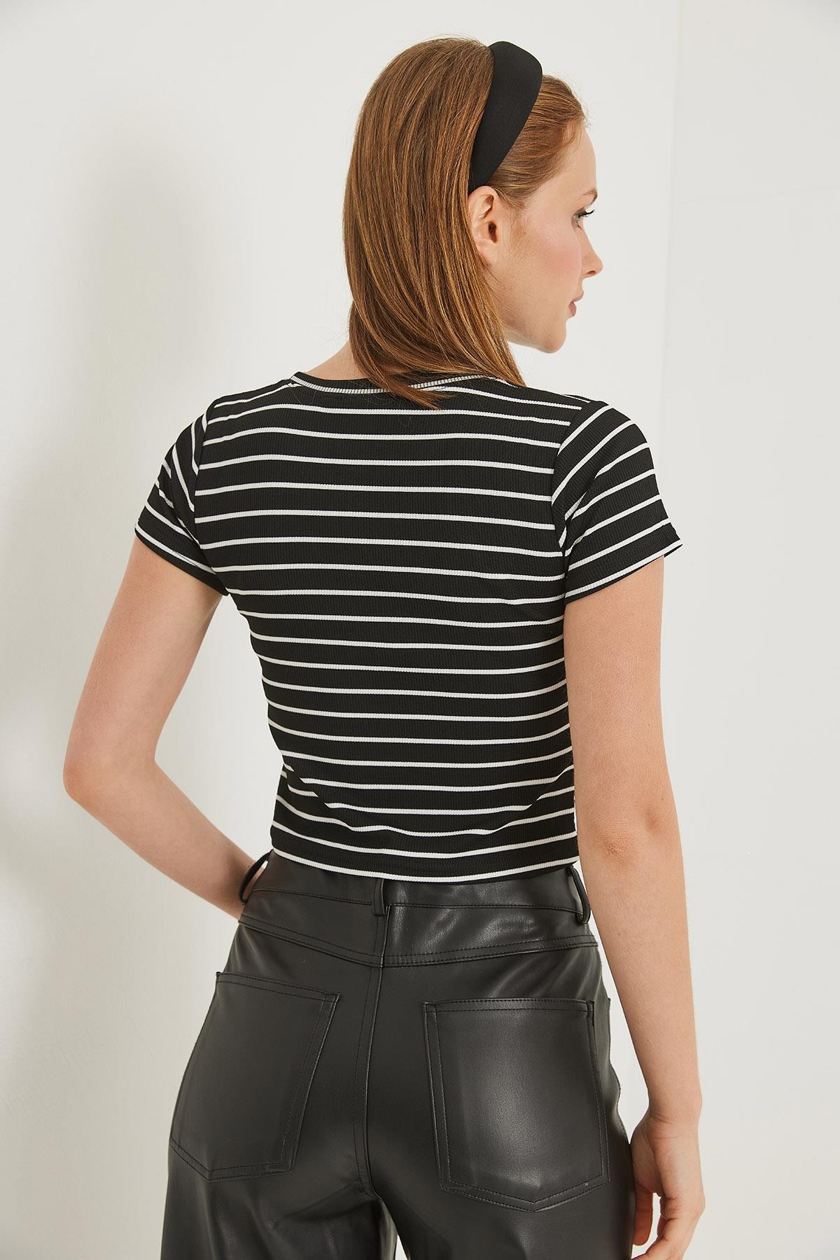 Bisiklet Yaka Kısa Kollu Çizgili Esnek Crop Bluz Siyah