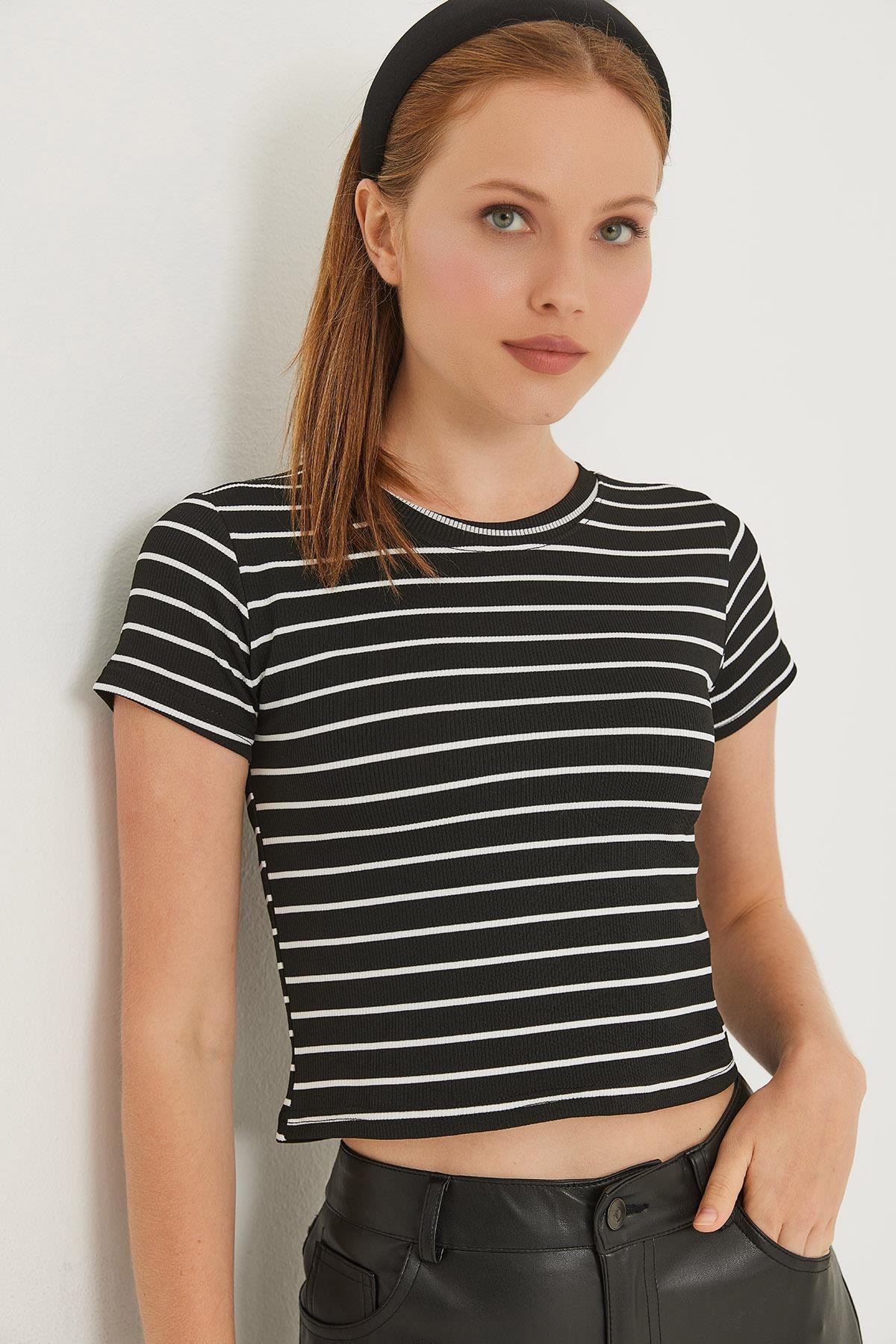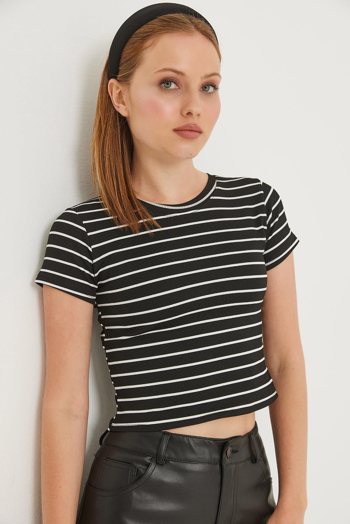Bisiklet Yaka Kısa Kollu Çizgili Esnek Crop Bluz Siyah (250679BLZXSYH)