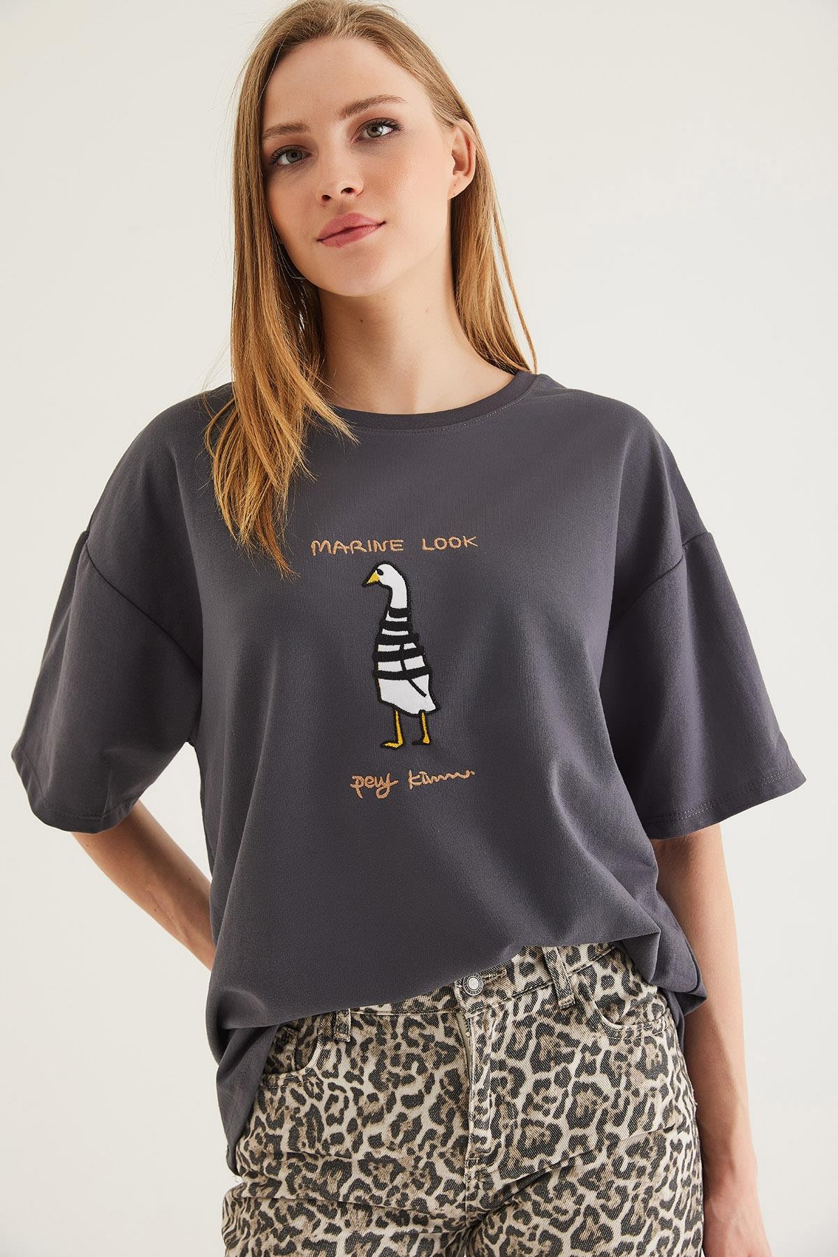 Bisiklet Yaka Oversize Baskılı Tshirt Füme