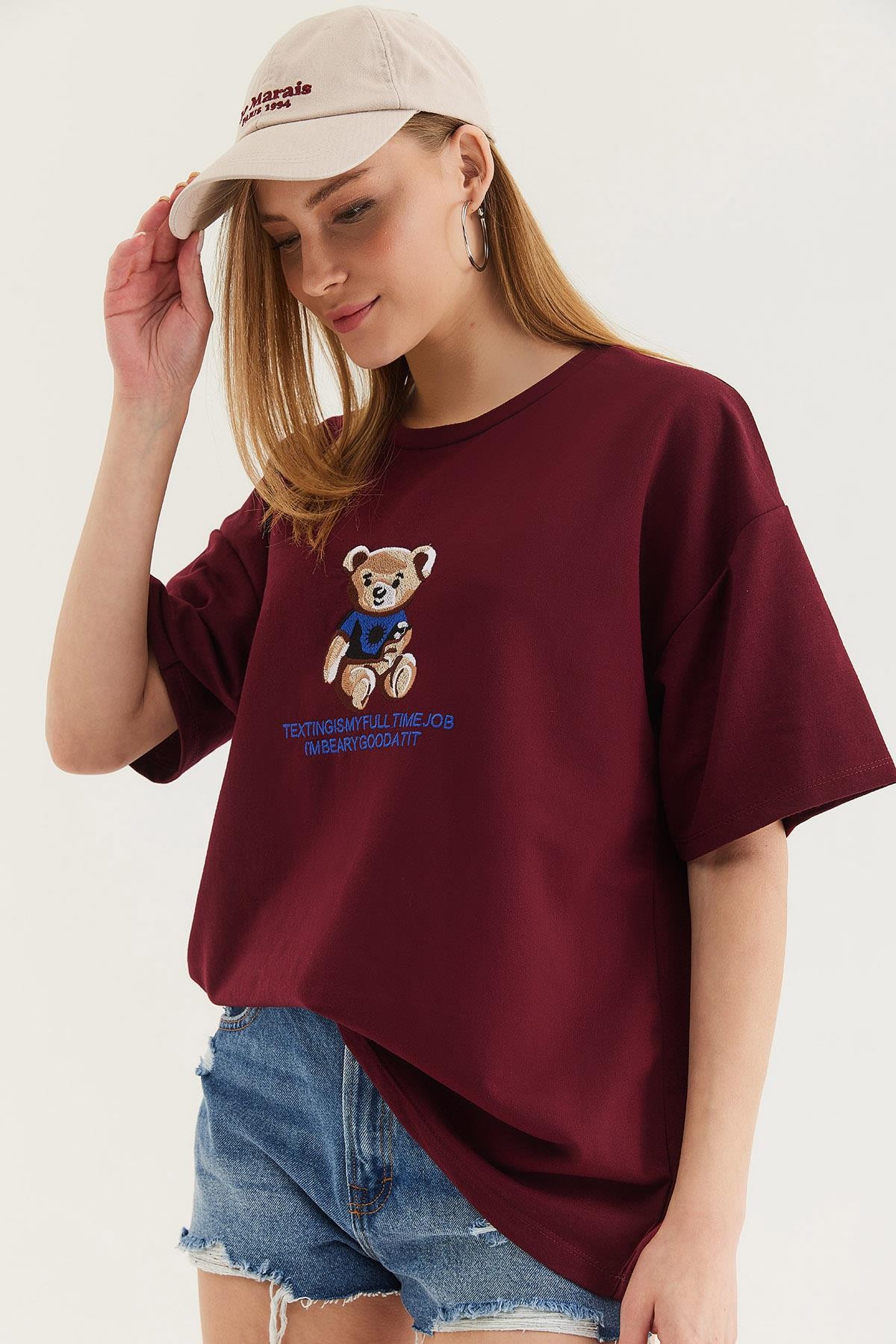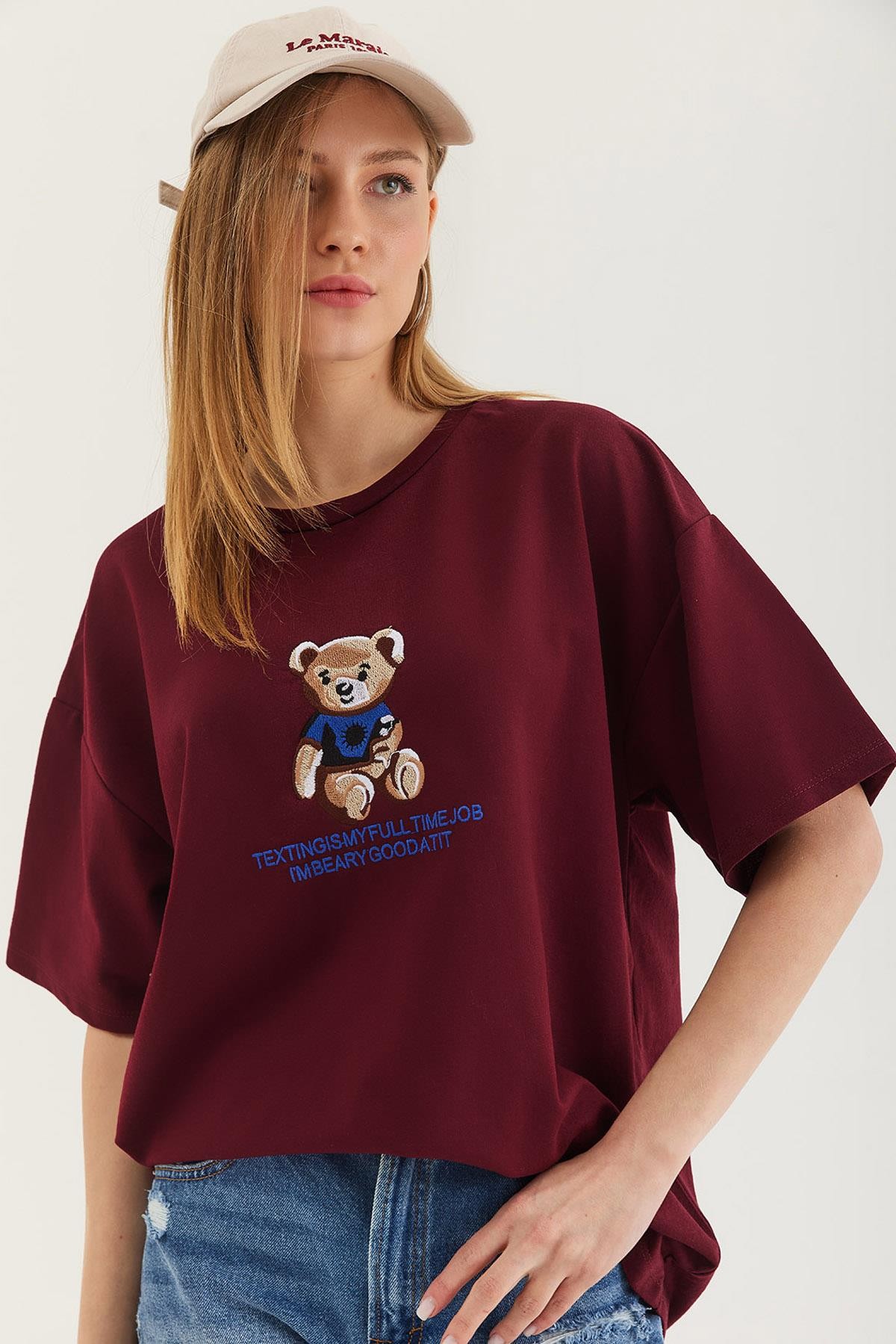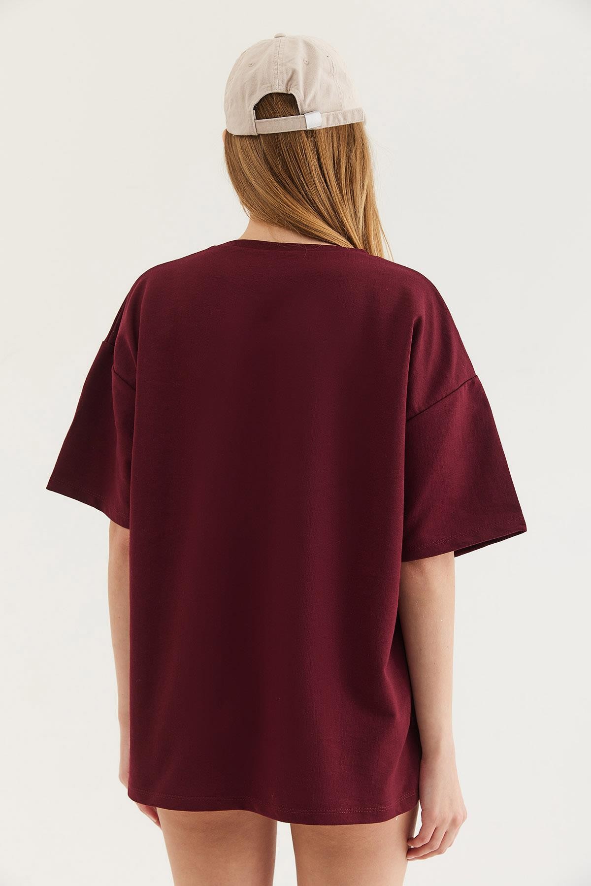 Bisiklet Yaka Oversize T-Shirt Bordo (250411TSHXBRD)