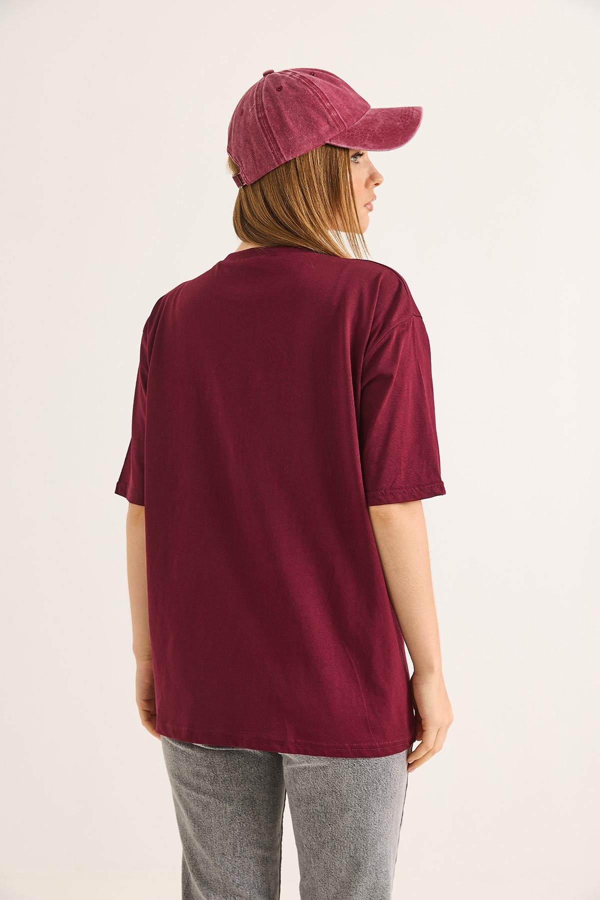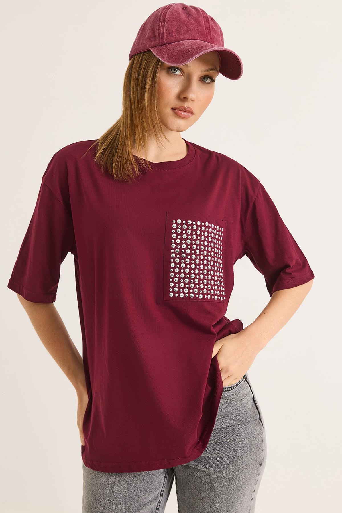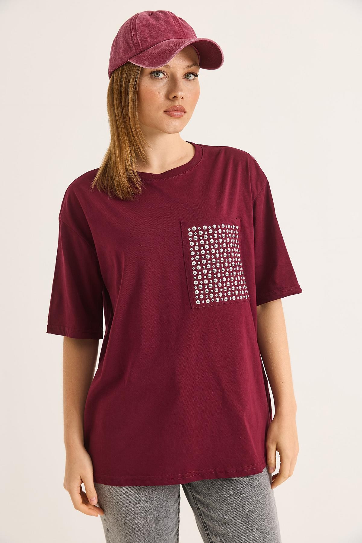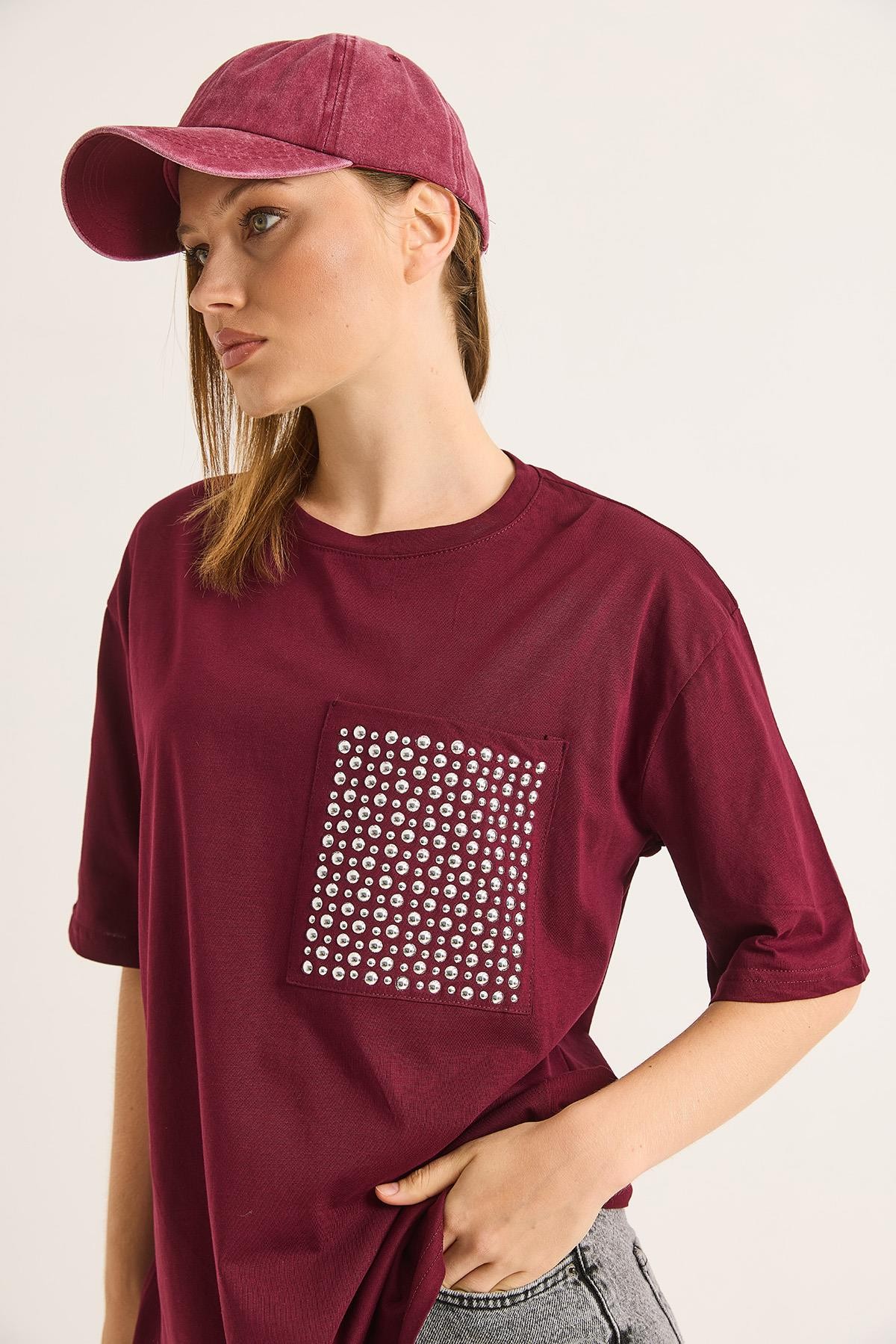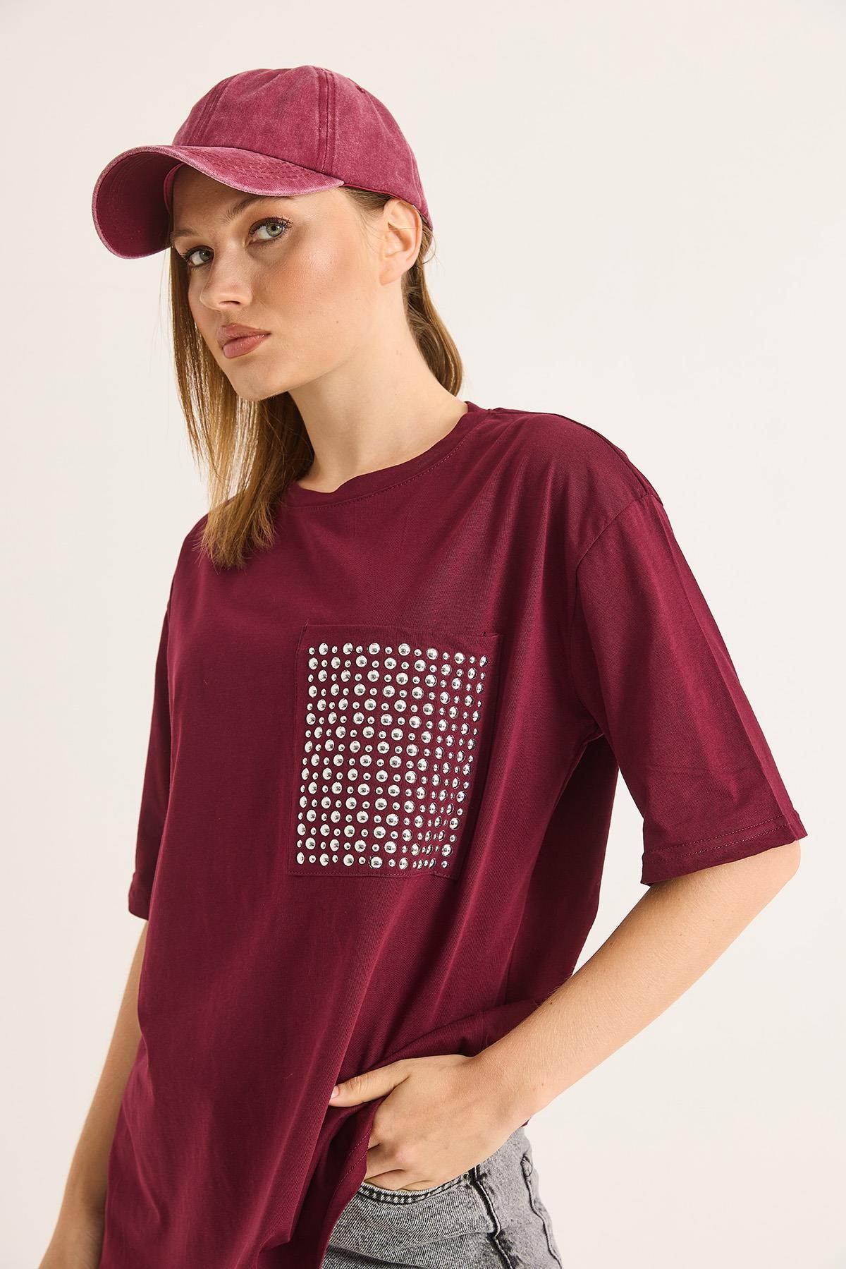 Bisiklet Yaka Taş Detaylı Cepli Tshirt Bordo (250704TSHXBRD)