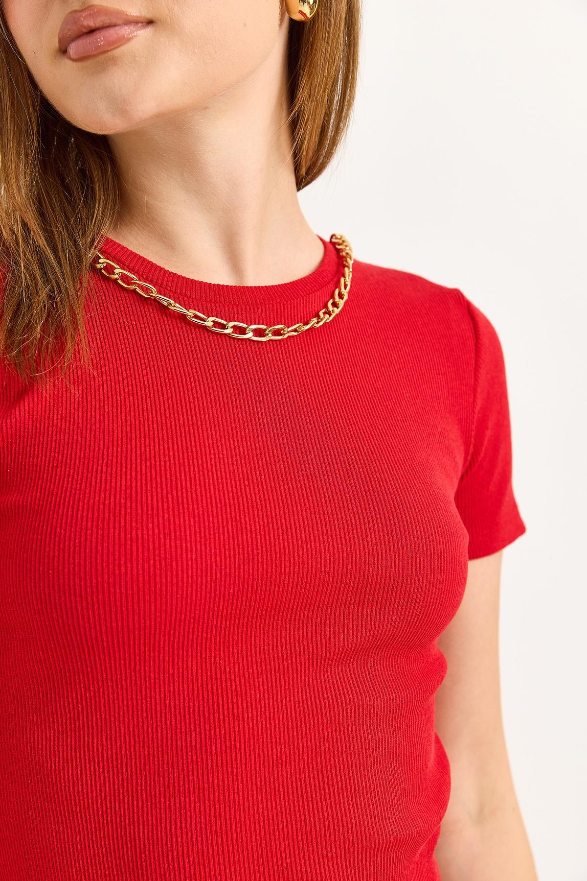 Bisiklet Yaka Zincir Detaylı Kaşkorse Bluz Kırmızı (500167BLZXKRMZ)