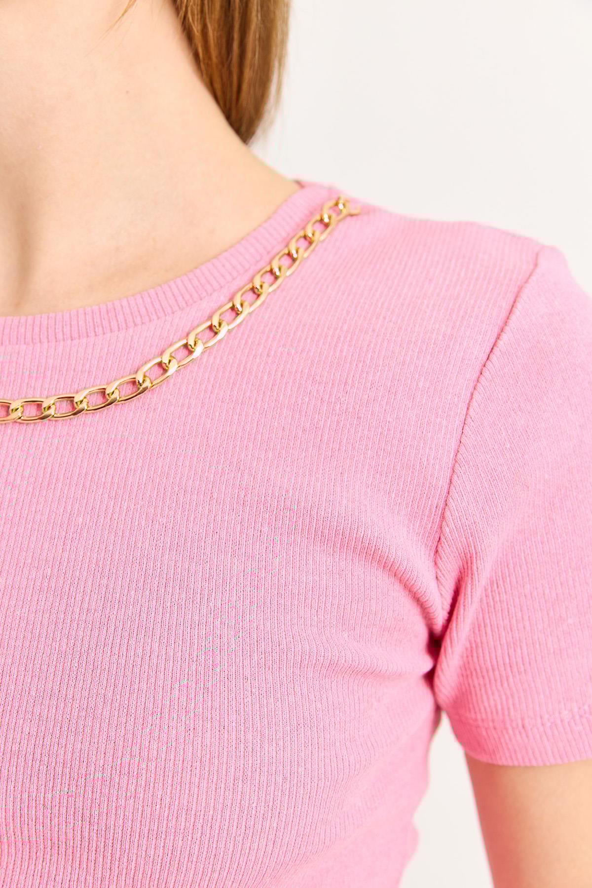 Bisiklet Yaka Zincir Detaylı Kaşkorse Bluz Pembe (500167BLZXPMB)