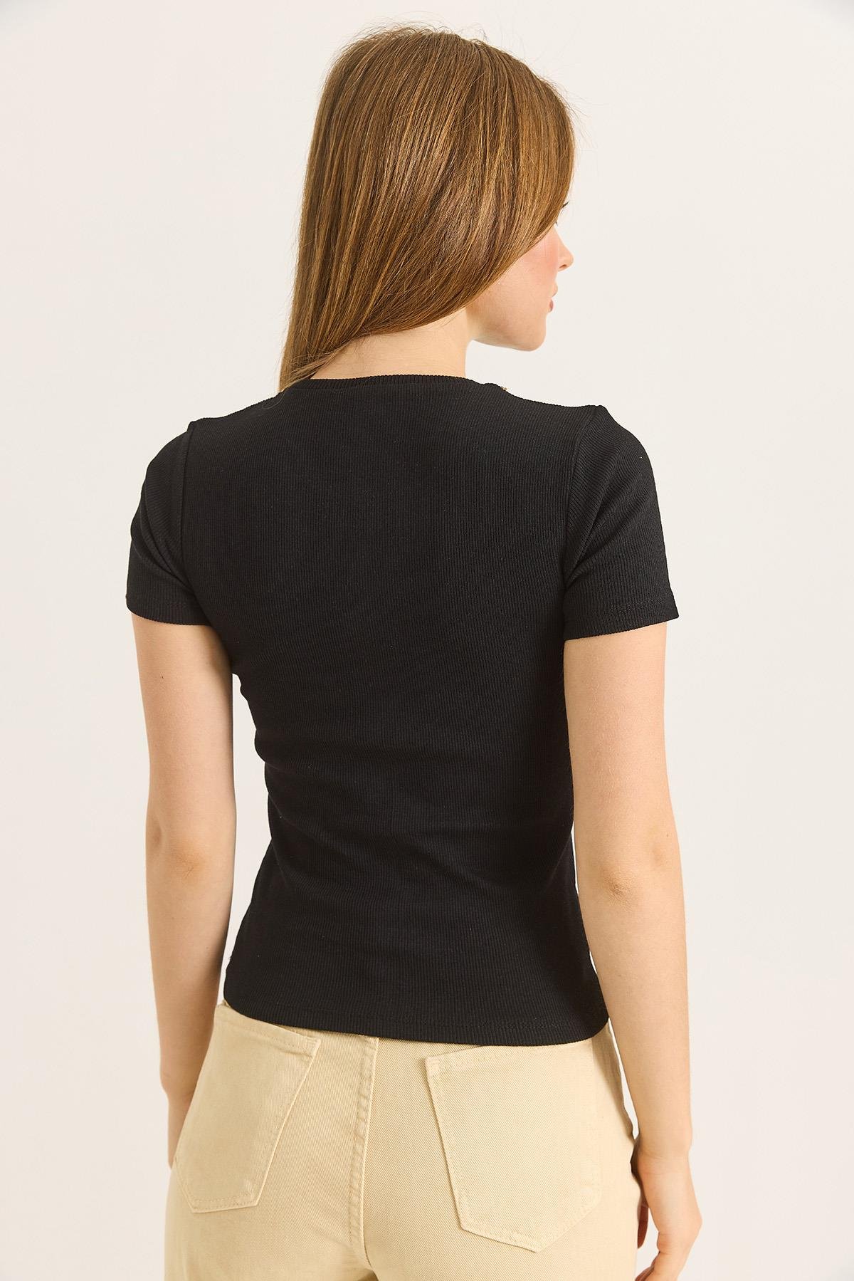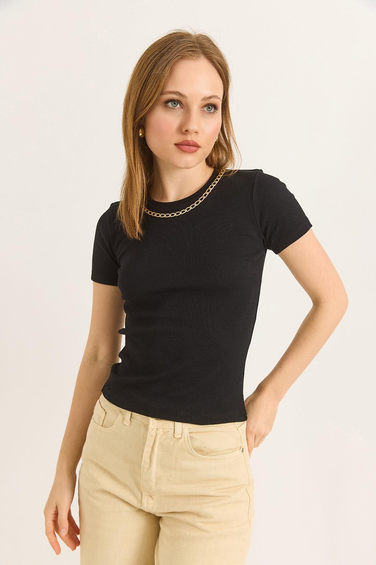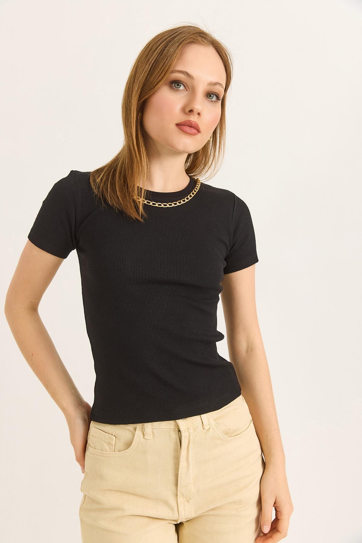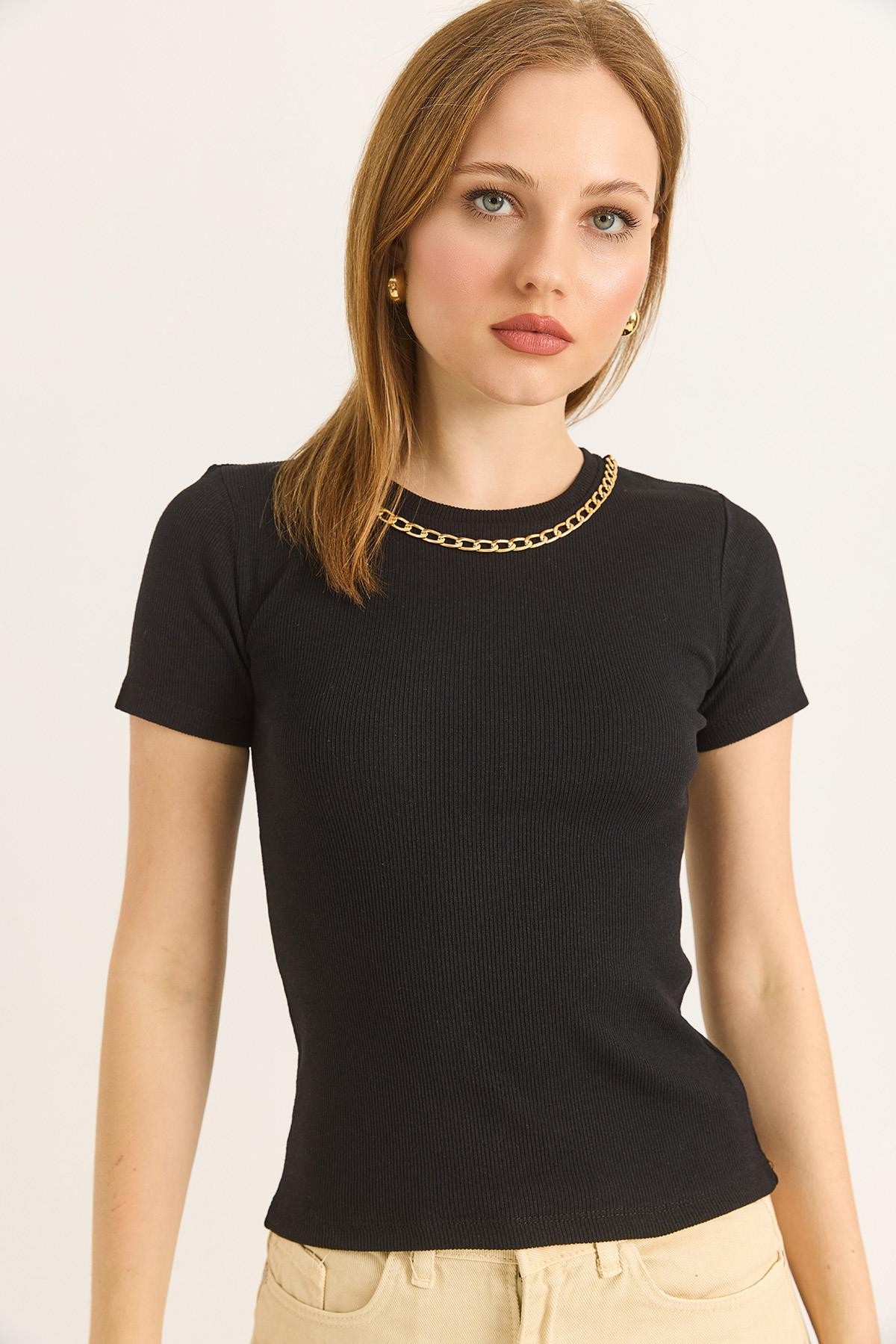 Bisiklet Yaka Zincir Detaylı Kaşkorse Bluz Siyah (500167BLZXSYH)