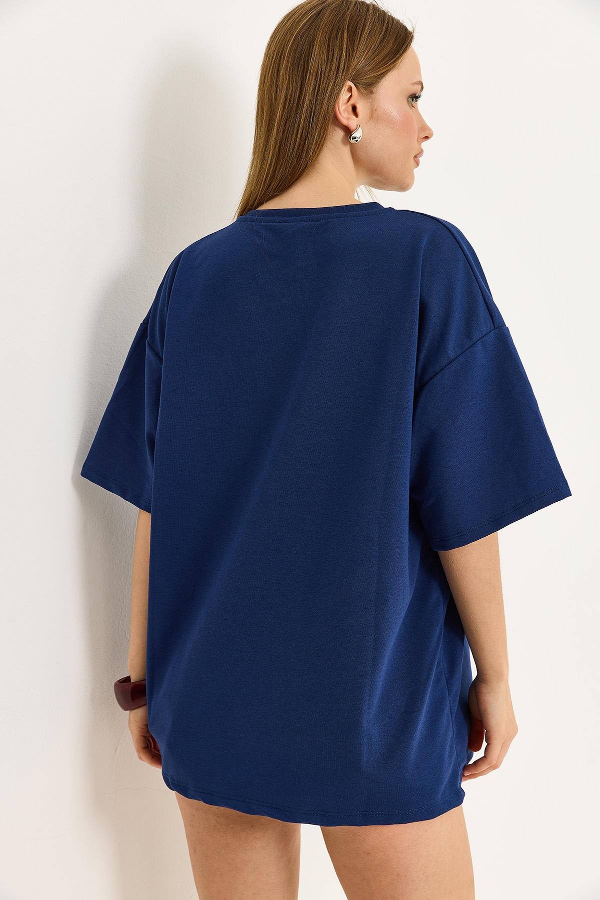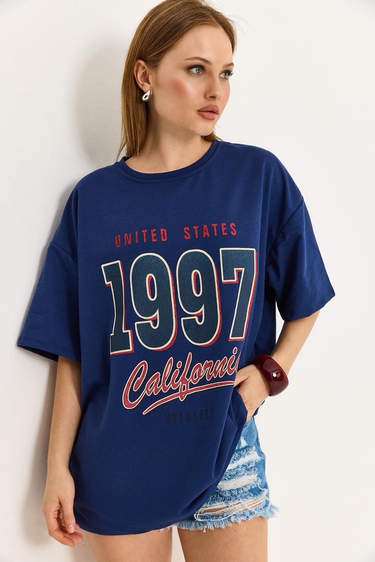 California Baskılı Oversize İki İplik Tshirt Lacivert (250715TSHXLCV)