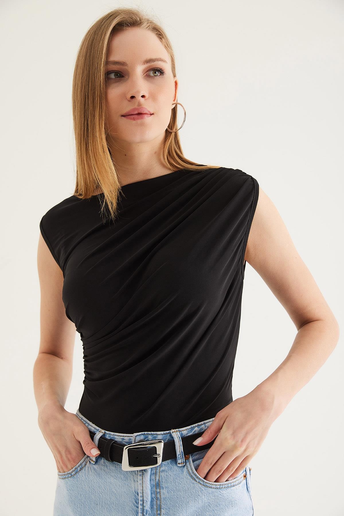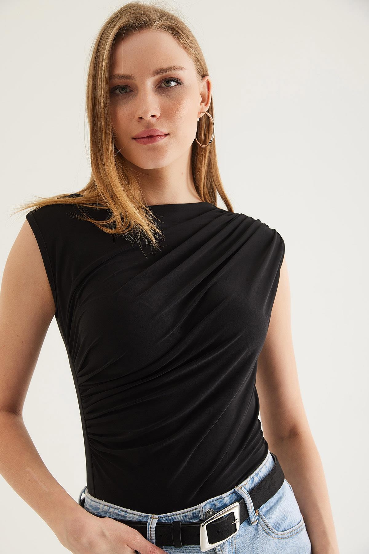Çapraz Büzgü Detaylı Kolsuz Bluz Siyah